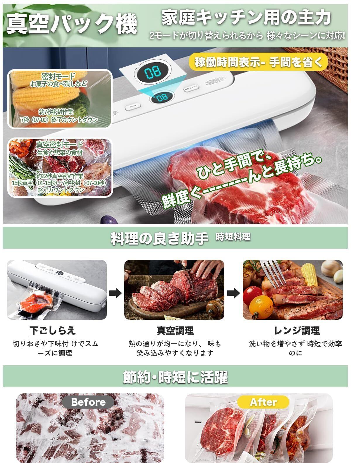 「真空パック機 フードシーラー」は、日々の食品保存をより効率的で便利にするために設計された強力なアイテムです。これを使うことで、新鮮な食材を長期間保存し、無駄のないライフスタイルをサポートします!