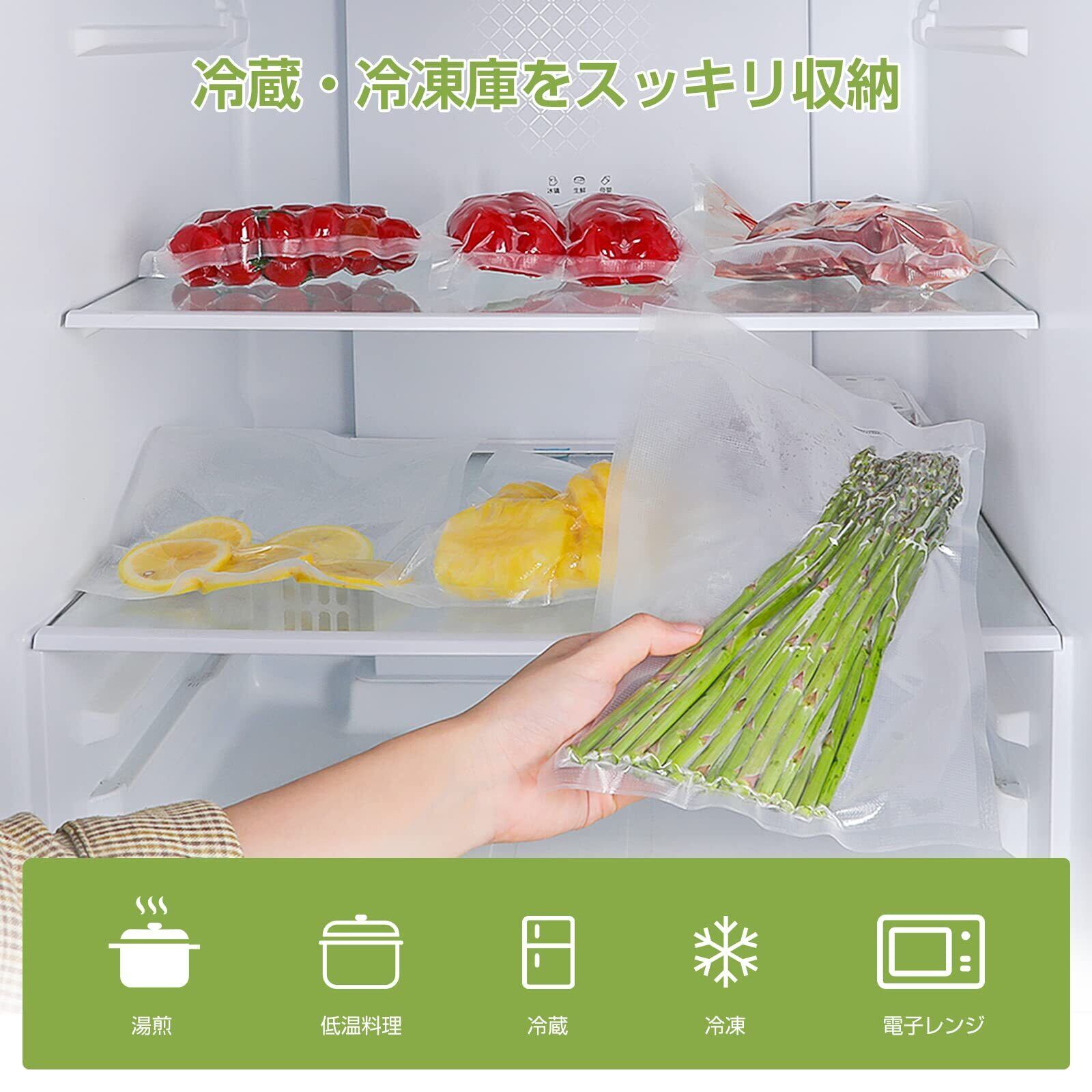 【使い勝手】空気を抜きとることによって食品の酸化、腐敗を抑制します。手触りがよく、内容物を潰さずに綺麗に真空パックすることができます。真空で鮮度密封、鮮度長持ち、冷蔵・冷凍庫をスッキリ収納できます。ご家庭では、たくさん作って冷凍保存・防災用品の保存に使い便利です。また、料理店・レストラン・ホテルの厨房・精肉店・寿司店・鮮魚店・冷凍食品製造業者・和洋菓子店など、様々な場所に適用可能です。※文中の「真空」は完全な真空状態のことではありません。JIS規格における「大気圧より低い圧力の気体で満たされた空間内の状態」を指します。