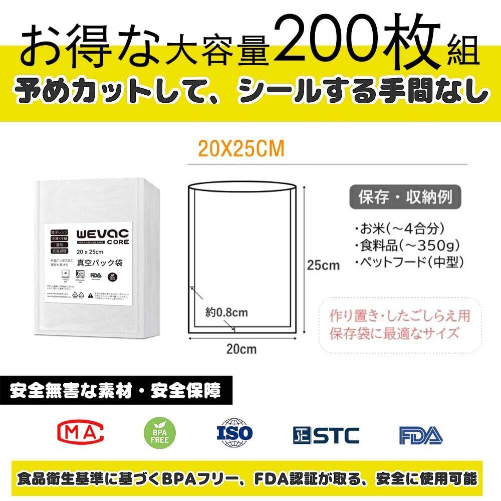 Wevac 真空パック 袋 エンボス加工 20×25cm 200枚 真空袋 カット済み 真空パック機 専用袋 脱気しやい 安全素材 BPAフリー フードシーラー 真空包装袋 抗菌袋 脱気密封 鮮度長持ち 食品保存 家庭用 業務用