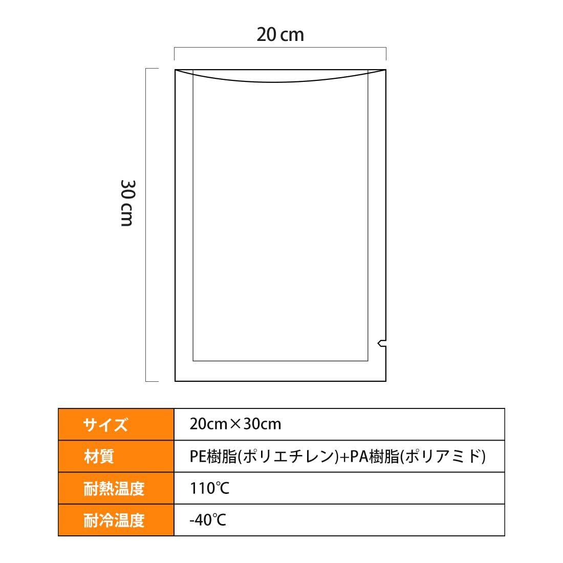 【商品仕様】サイズ:20cm×30m×50枚 耐熱温度と耐冷温度はそれぞれ驚異的な110℃と-40℃。冷凍食品から水分含有食品までもちろん、低温調理や生鮮食品、お魚、釣り餌、犬のフード、お米、防災用品などの保存するのに最適です。ほぼ全ての真空パック機にもご使用になれます。柔軟性と透明性・光沢感も抜群、美味しく見えるので、家庭用はもちろん、強度抜群で業務用・販売用にもオススメです。しかもサイドにノッチ付き、ハサミ要らずでとても便利。