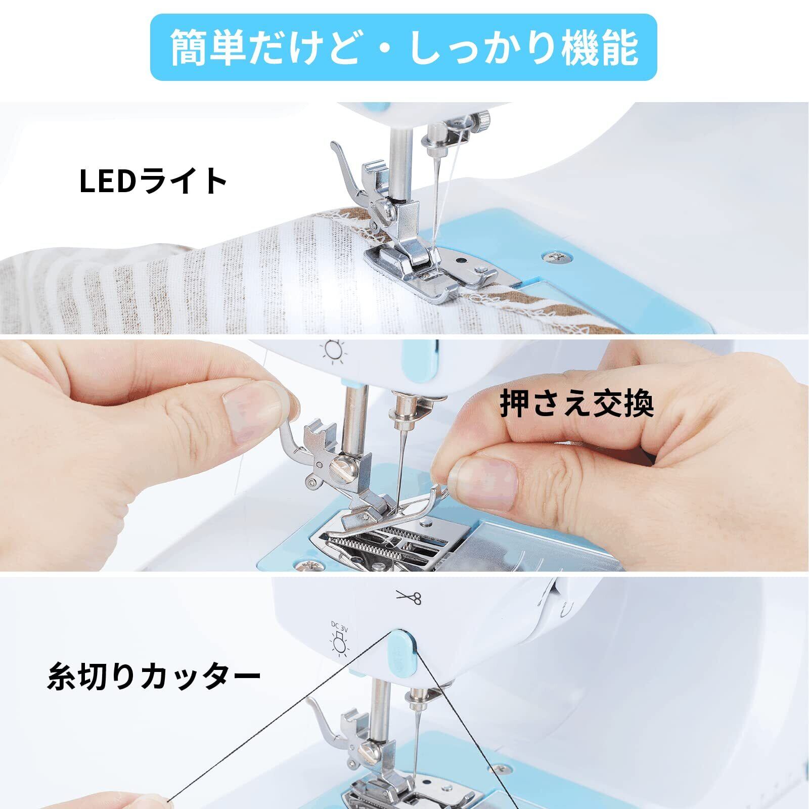 【12種類の縫い目】:地縫い、ジグジグ縫い、まつり縫い、ボタンホール、裾上げの用途に対応し、正/逆縫いモード、高速および低速モードをサポートし、自分に対して最適なモードを楽に選択できます。よく使う12種類の縫い目をダイヤルで回すだけで縫い模様の切替が可能。