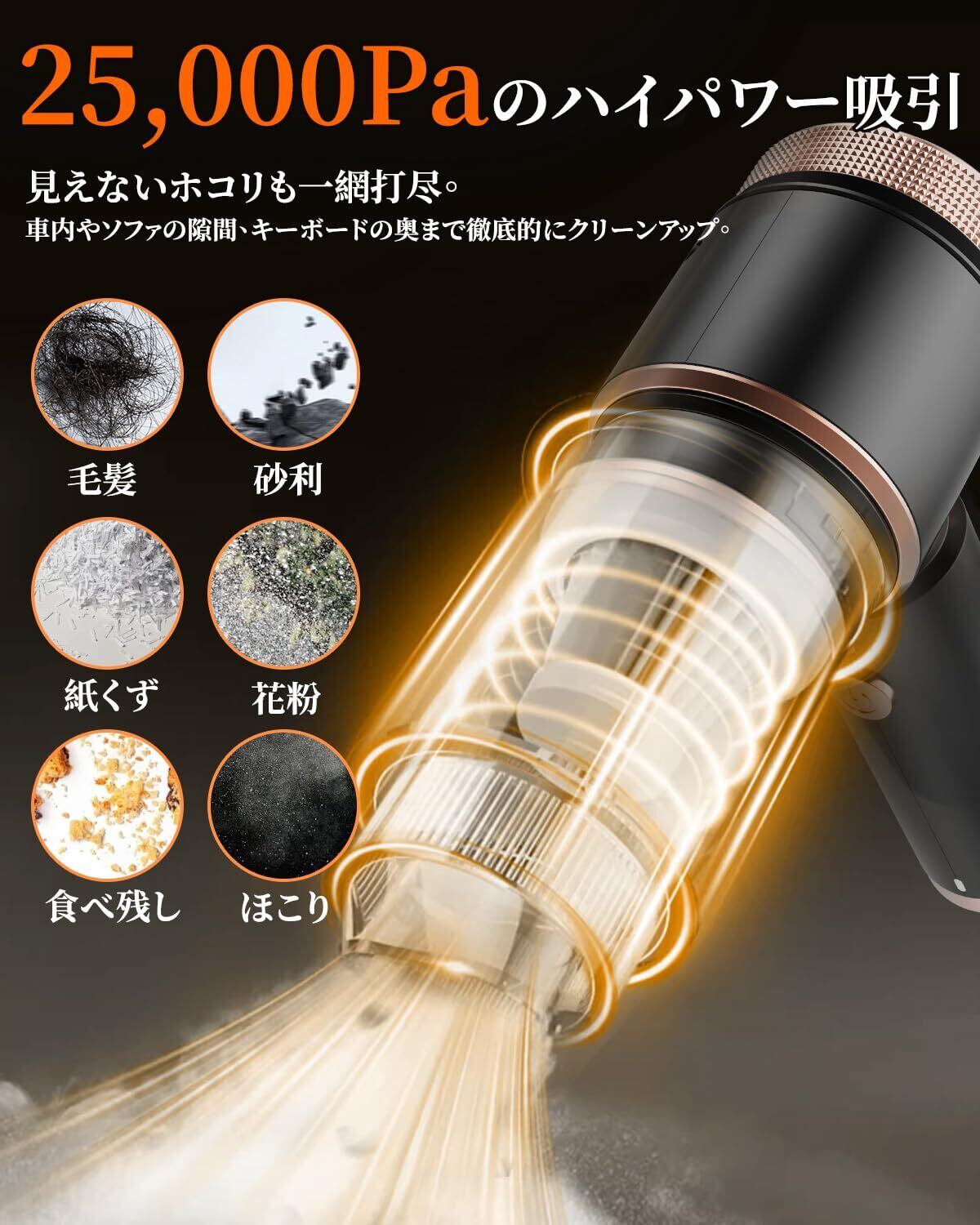 ②【強力吸引×ブラシレスモーター搭載】 最大吸引力は驚異の25000Pa。高効率なブラシレスモーターを採用することで、従来型に比べて吸引力の安定性が高まり、ノイズを抑えながらもしっかりとゴミを除去。ペットの毛や食べかす、花粉、車内の砂までパワフルに吸引し、清潔な空間を素早く実現します。