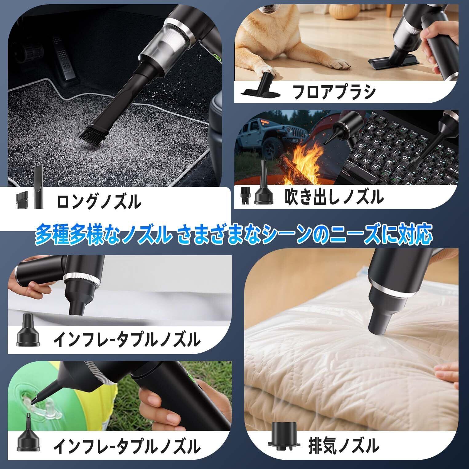 【業界最強37000PA吸引 & 5in1多機能】プロ級の性能でどんな汚れも一掃 車内の砂埃、食べかす、ペットの毛はもちろん、家庭のソファやキーボードの細かいゴミまで、業界トップクラスの37000PAの強力吸引で徹底除去。さらに、吸引/空気入れ/排気/吹き飛ばし/独立照明の5役をこなす一台完結のマルチクリーナー。