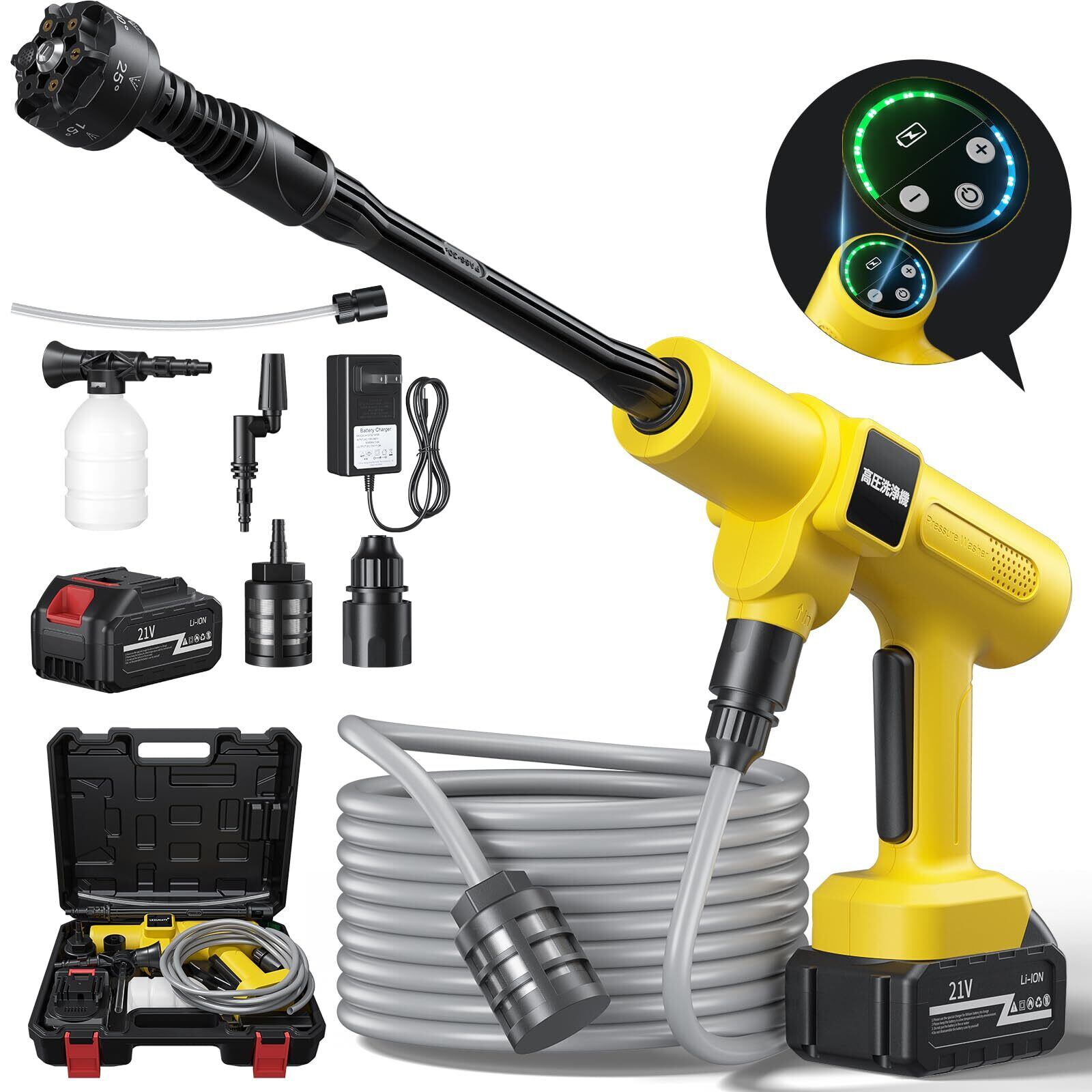【2025新登場強化版】高圧洗浄機 コードレス 充電式 バッテリー式 洗車機 20000mAh マキタ互換バッテリー 残量表示 洗車店監修 750W 軽量 小型 自吸式 噴射距離10M 洗車 家庭用 2段階 6in1ノズル 水道接続不要 収納ケー付き 持ち運び便利 庭/屋外/階段/ガラス/ブロック塀/玄関/ベランダ/浴室/年末大掃除/キャンプ 日本語取扱説明書 イェロー