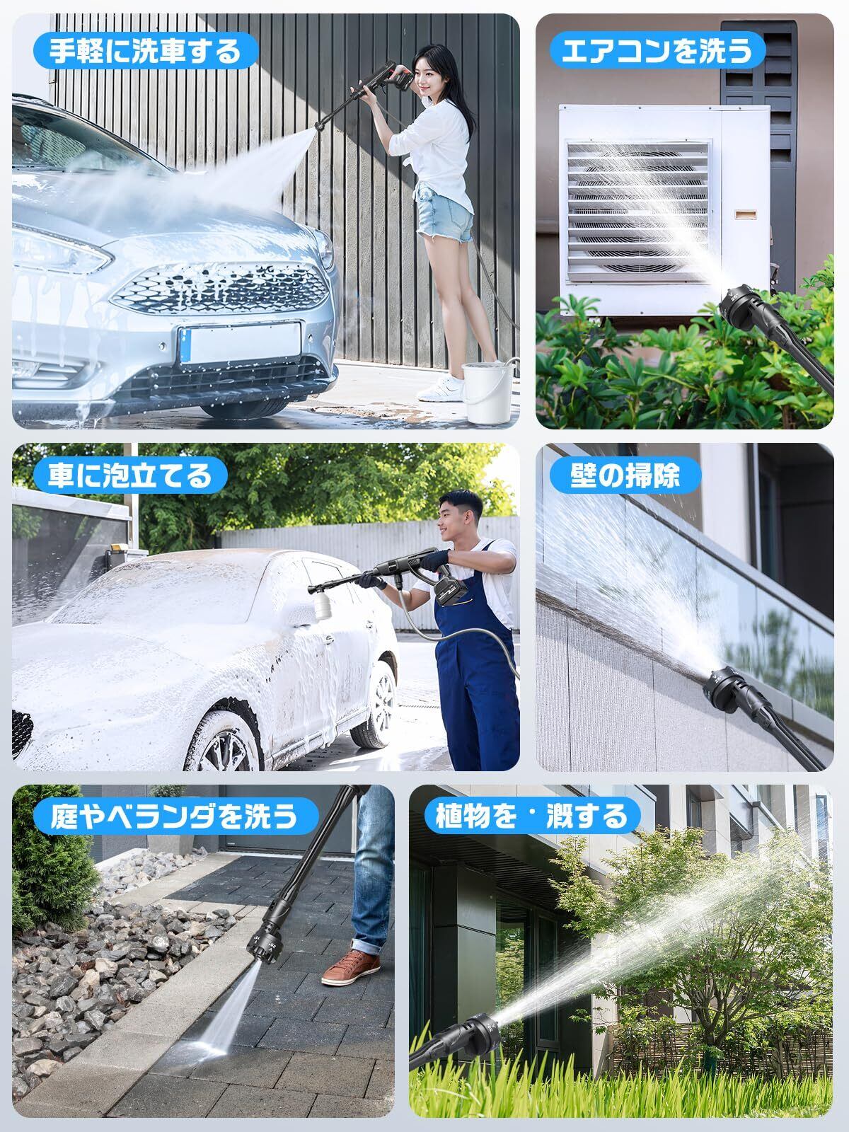 この充電式高圧洗浄機は、20000mAhのバッテリーを搭載し、電源を気にせず、お好きな場所で作業が可能です。高圧でしっかりと頑固な汚れを落とし、洗車や庭の掃除、キャンプ道具の清掃まで幅広く活躍します。