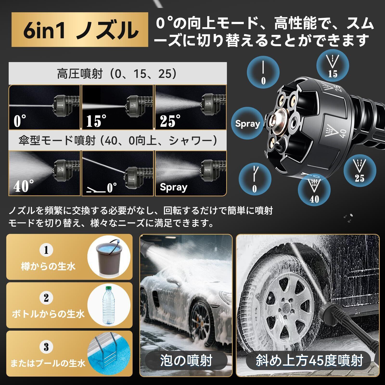 高圧洗浄機 2025年次世代版 9MPa高圧洗車機 コードレス 耐候性ブラシレスモータ 充電式 吐出孔径20%拡大 安全ロック設計 LED残量表示 PSE認証済 3000mAhバッテリー2個 マキタバッテリー互換 6in1多機能ノズル 7m耐久ホース 厚手フォームボトル ペットボトル給水対応 節水 軽量 改良収納ケース 洗車 駐車場 庭 外壁 ベランダ 窓 網戸 ガラス 玄関 浴室 墓石掃除