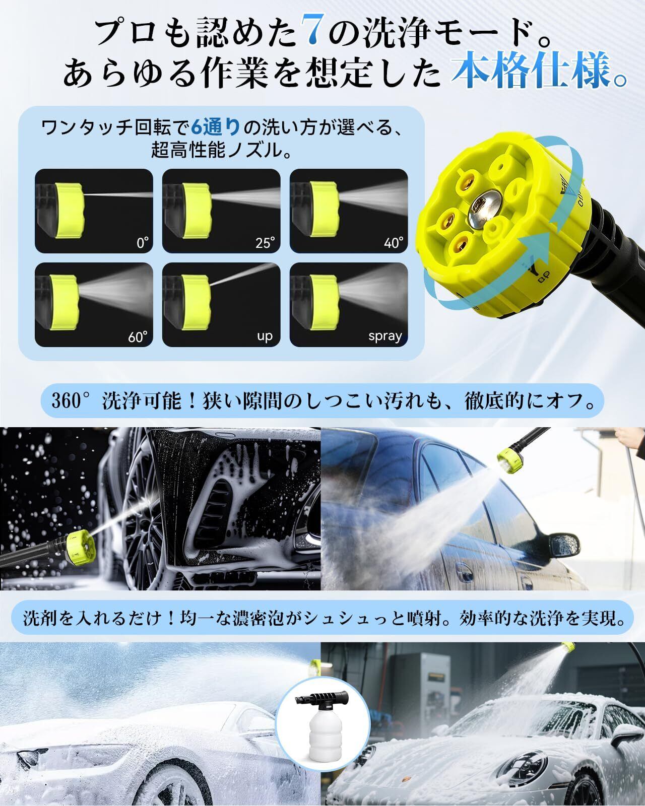 【6in1 多機能ノズル】このコードレス高圧洗浄機は0°/15°/25°/40°/シャワー/ファンなど6種類のモードを1つのノズルに合わせた。ノズル先端を回転させることで噴射角度を切り替えます。洗車、ガーデン、アウトドア、階段、網戸と窓ガラス、レンガ壁【6in1 多機能ノズル】このコードレス高圧洗浄機は0°/15°/25°/40°/シャワー/ファンなど6種類のモードを1つのノズルに合わせた。ノズル先端を回転させることで噴射角度を切り替えます。洗車、ガーデン、アウトドア、階段、網戸と窓ガラス、レンガ壁、外壁、駐車場、玄関、自転車とバイク、ベランダ、高台、家の周り、年末の大掃除、キャンプ用品の清掃、BBQの清掃など、さまざまな洗浄シーンに適応することができます。発泡ガンモードに変更することもでき、洗浄剤をボトルに入れて高圧洗浄機に取り付けるだけで、使いやすい エレクトロニクス。、外壁、駐車場、玄関、自転車とバイク、ベランダ、高台、家の周り、年末の大掃除、キャンプ用品の清掃、BBQの清掃など、さまざまな洗浄シーンに適応することができます。発泡ガンモードに変更することもでき、洗浄剤をボトルに入れて高圧洗浄機に取り付けるだけで、使いやすい エレクトロニクス。