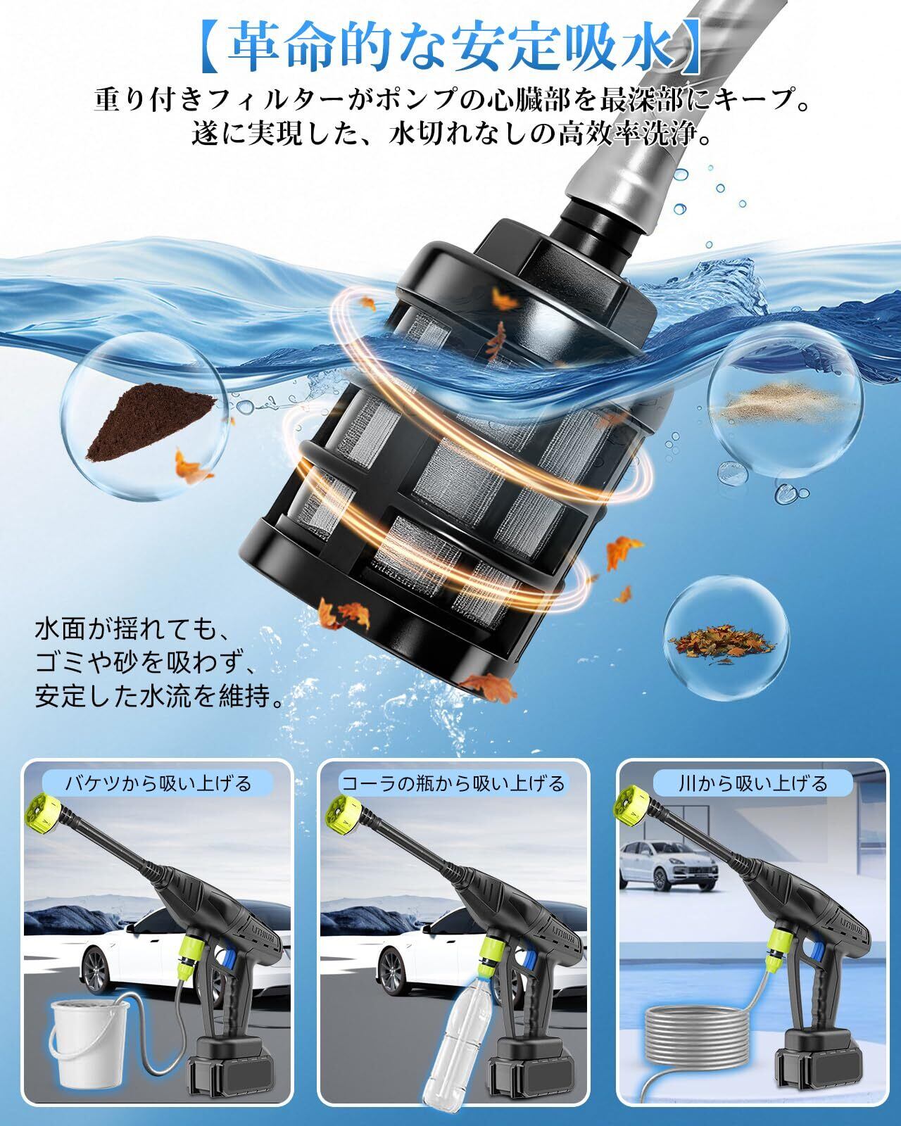 【効率的に洗浄】高圧洗浄機の魅力は、水をかけるだけで簡単に掃除できることです。66.9%の水使用量を削減しながら、頑固な汚れを強力な水圧でしっかり取り除きます。この高圧洗浄機は壁の隅の隙間でも、車のタイヤのホイールでもきれいに洗浄でき、庭の花やペットのお風呂や水遊びにも使用でき、5 mのホースが装備されているため、水を戻すことはできません エレクトロニクス。 【複数の適用シーン&使い勝手】給水ホースをバケツや池に入れた水を汲むだけで、水のある場所でも使える高圧洗浄機です。フィルターはろ過機能があるため、湖、川、貯蔵された雨水にも使用できる。同時に私たちは水道代を節約することができます。5メートルの軟水管も備えており、水の汲み取りや移動に便利です エレクトロニクス。 【6in1 多機能ノズル】このコードレス高圧洗浄機は0°/15°/25°/40°/シャワー/ファンなど6種類のモードを1つのノズルに合わせた。ノズル先端を回転させることで噴射角度を切り替えます。洗車、ガーデン、アウトドア、階段、網戸と窓ガラス、レンガ壁【6in1 多機能ノズル】このコードレス高圧洗浄機は0°/15°/25°/40°/シャワー/ファンなど6種類のモードを1つのノズルに合わせた。ノズル先端を回転させることで噴射角度を切り替えます。洗車、ガーデン、アウトドア、階段、網戸と窓ガラス、レンガ壁、外壁、駐車場、玄関、自転車とバイク、ベランダ、高台、家の周り、年末の大掃除、キャンプ用品の清掃、BBQの清掃など、さまざまな洗浄シーンに適応することができます。発泡ガンモードに変更することもでき、洗浄剤をボトルに入れて高圧洗浄機に取り付けるだけで、使いやすい エレクトロニクス。、外壁、駐車場、玄関、自転車とバイク、ベランダ、高台、家の周り、年末の大掃除、キャンプ用品の清掃、BBQの清掃など、さまざまな洗浄シーンに適応することができます。発泡ガンモードに変更することもでき、洗浄剤をボトルに入れて高圧洗浄機に取り付けるだけで、使いやすい エレクトロニクス。 【安全性と信頼性&高いアフターサービス】洗車店監修!信頼性の高い高圧洗浄機は新たにアップグレードされたブラシレスモータを搭載し、多種のノズルヘッドに合わせて、どんな頑固な汚れも洗浄することができます。製品は90日間の品質を享受して、私達は優秀な製品のアフターサービスチームを持って、いかなる製品の使用あるいは品質の問題、あなたがすぐに私達と連絡することができること(Tips:製品出荷時に様々な機能や細部の検査を経て、水汚れが出るのは正常な現象です。ご不満の場合は、オペレーターにご連絡いただき返品・返金をお願いいたします) エレクトロニクス。