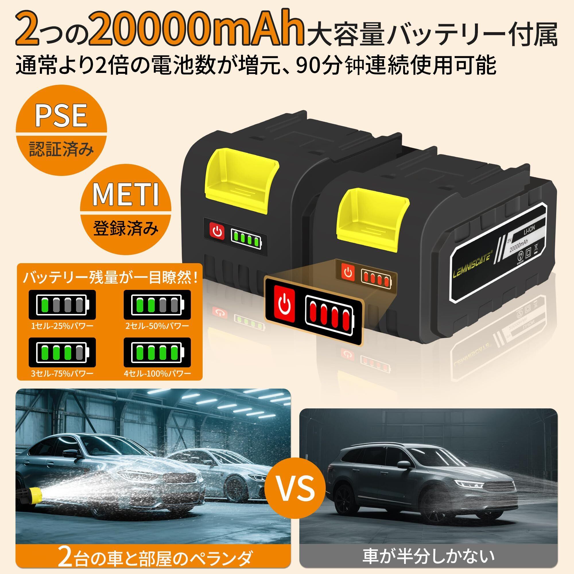 【大容量20000mAhバッテリー×2・残量表示付き】PSE認証を取得した安全性の高い大容量バッテリー(20000mAh)を2個同梱。コードレス高圧洗浄機で長時間の作業も安心です。バッテリー残量が確認できるので、切れる心配もありません。充電式高圧洗浄機として、アウトドアや車用掃除にも最適です。