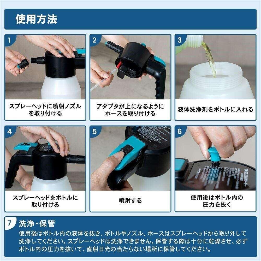 【特長】 ●電動式でお手軽泡洗浄 ●ポンピング作業不要で時短 ●ロック式で持続噴射に切り替え可能 ●充電式でくりかえし使える(充電口 Type-C) 【仕様】 ●使用電池:リチウムイオンバッテリー(1300mAh×2個) ●電池使用回数(約):300回 ●充電時間(約):3時間 ●連続使用時間(約):20分 ※使用時間は目安です。 ●ボトル容量(約):1.5L ●電源:USB(Type-C出力 5V-1A) ●材質:スプレーヘッド/ABS樹脂 噴射ノズル/ポリプロピレン、ポリアセタール樹脂 ボトル/高密度ポリエチレン ●セット内容:スプレーヘッド×1点、噴射ノズル×1本、ボトル×1点、予備フィルター×2点、USB A to Type-Cケーブル×1点 ※USBポート付電源出力機器は付属しておりません。