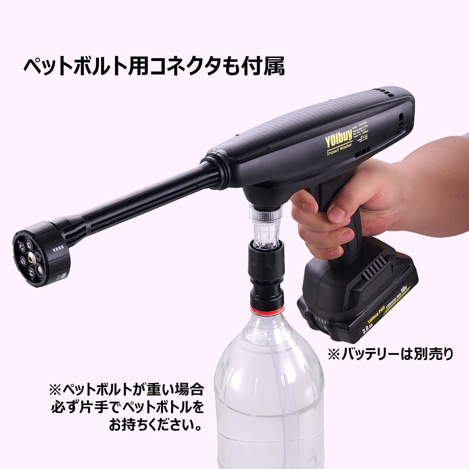 YOIbuy PRO が開発した新製品 充電式インパクト洗浄機 独自なパルス噴射技術でただの吐出圧力ではなくパルス噴射によるインパクト(衝撃力)で洗浄する新発想! 「洗浄力をきまるのは圧力ではなく、衝撃力!」 同価格帯のハンディ洗浄機では驚くほどな洗浄力を実現、最強コスパの洗浄機。