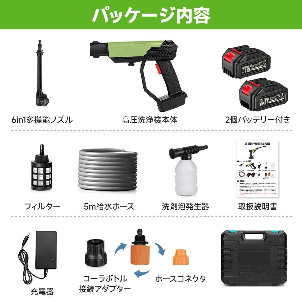 【パッケージ内容12ヶ月品質】パッケージ内容:高圧洗浄機本体 x 1、3.0Ahの大容量バッテリー2個、充電器 x 1、6 in 1 ノズル x 1、5mの給水ホース x 1、コーラ瓶コネクター x 1、泡ボトル x 1、汲水フィルタ x 1、収納ボックス x 1、日本語取扱説明書 x 1。こちらの製品にはPSE認証を取得しておりますので、ご安心してご利用ください。ご購入日から30日以内に故障があった場合、交換または返金致します。ご購入日から12ヶ月間には、製品に不具合が生じた場合は、または何がご不明なところがございましたら、ご遠慮なくまでご連絡ください。当店は無料で交換が々なシーンでの使用に適しています。