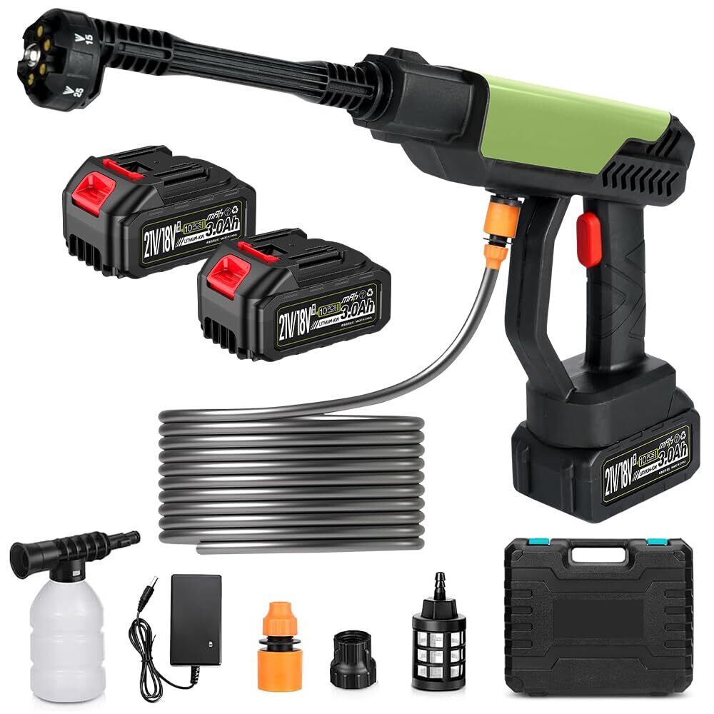 UPF 高圧洗浄機 MAX 8MPa 高圧洗浄機 コードレス 充電式 2個3.0Ahバッテリー付き マキタ18V互換バッテリー対応 6in1多機能ノズル 噴射距離10M 高圧洗車機 5mホース 軽量 ポータブル 家庭用洗車機 洗車 駐車場 庭 外壁 階段 黄砂 ベランダ 窓 網戸 ガラス 玄関 浴室 墓石掃除 フォームガン 収納ケース付き 日本語取扱説明書