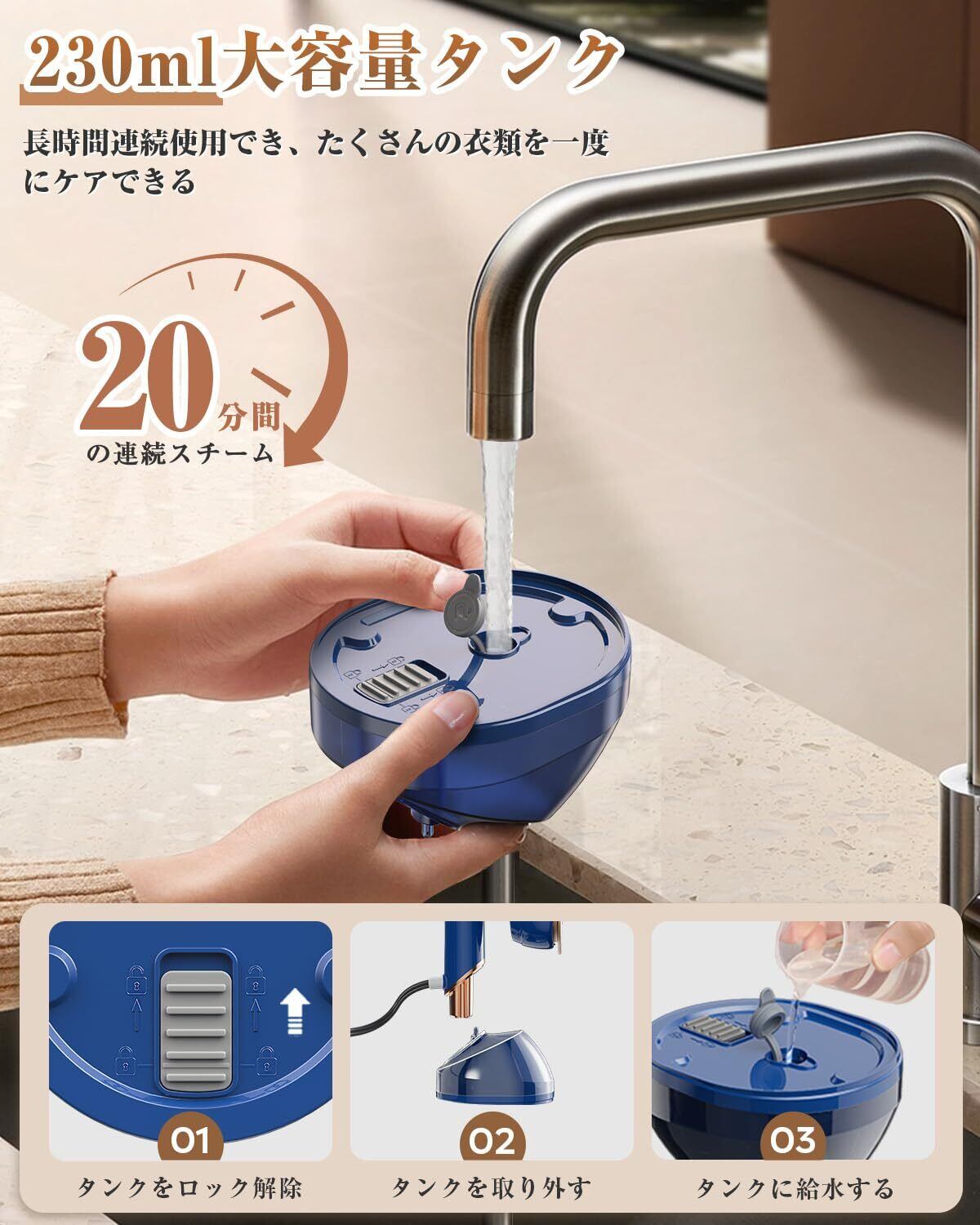 230mlの大容量タンクを備え、一度の給水でたっぷりスチームを使えます。さらに、タンクが取り外し可能なので、給水も簡単。毎回の準備がスムーズです。