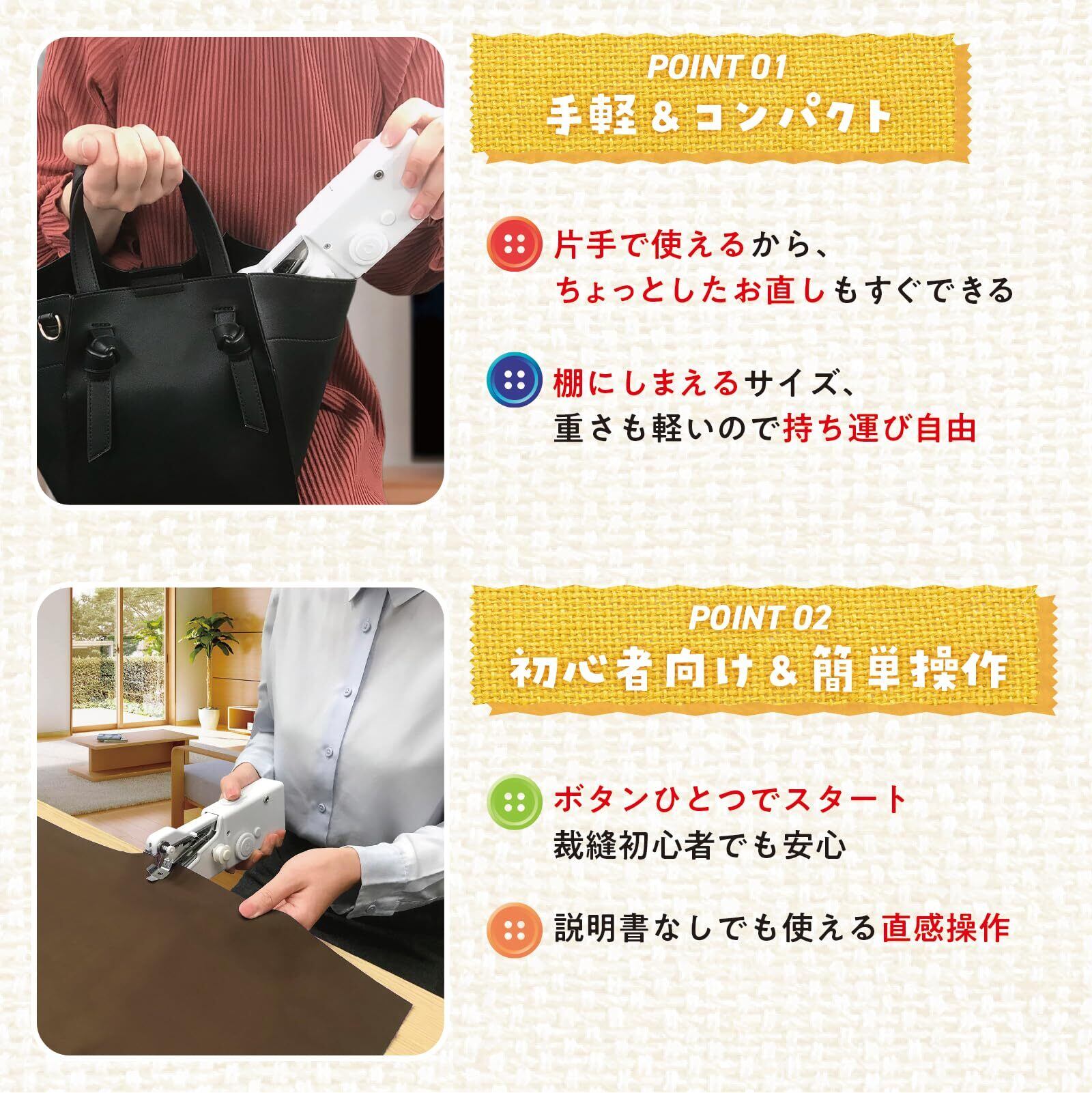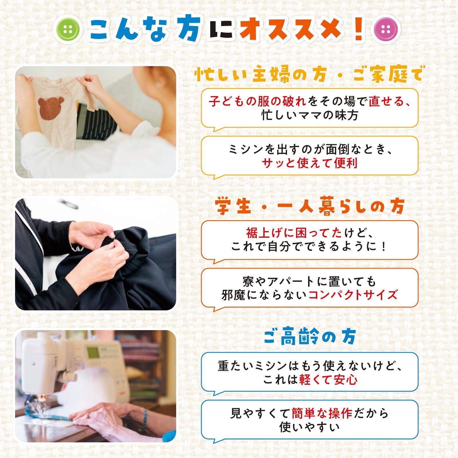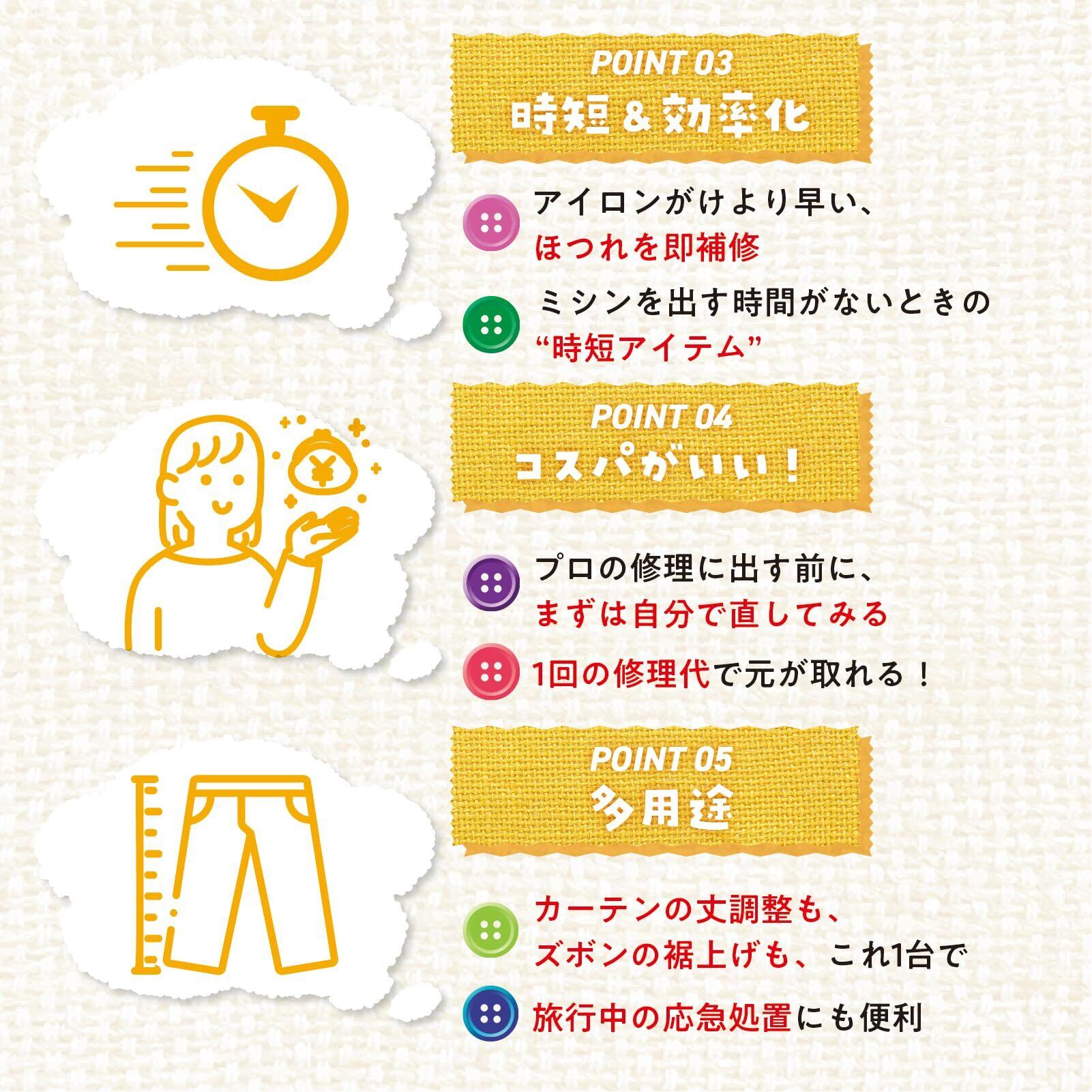 小物の修理や衣類の補修、DIYプロジェクトなど、多彩な使い方が可能です。思い立った時に気軽に使えるので、日常の裁縫ニーズをしっかりサポートします。自分だけのオリジナルアイテム作りにも最適です!