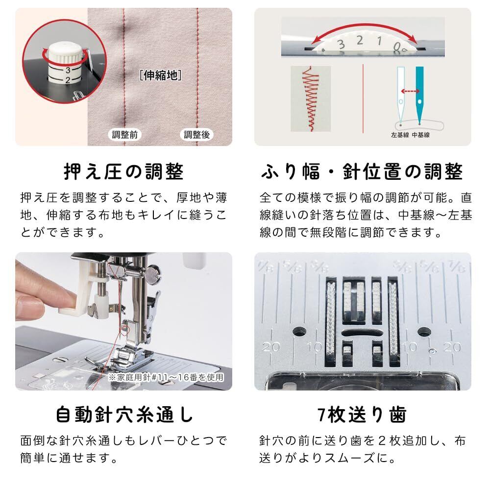 自動糸調子や縫い目パターンの選択も簡単で、初心者でもすぐに使いこなせる機能が盛りだくさん。衣類のお直しから創作活動まで幅広く活用できるため、あなたのアイデアを思う存分形にすることができます。