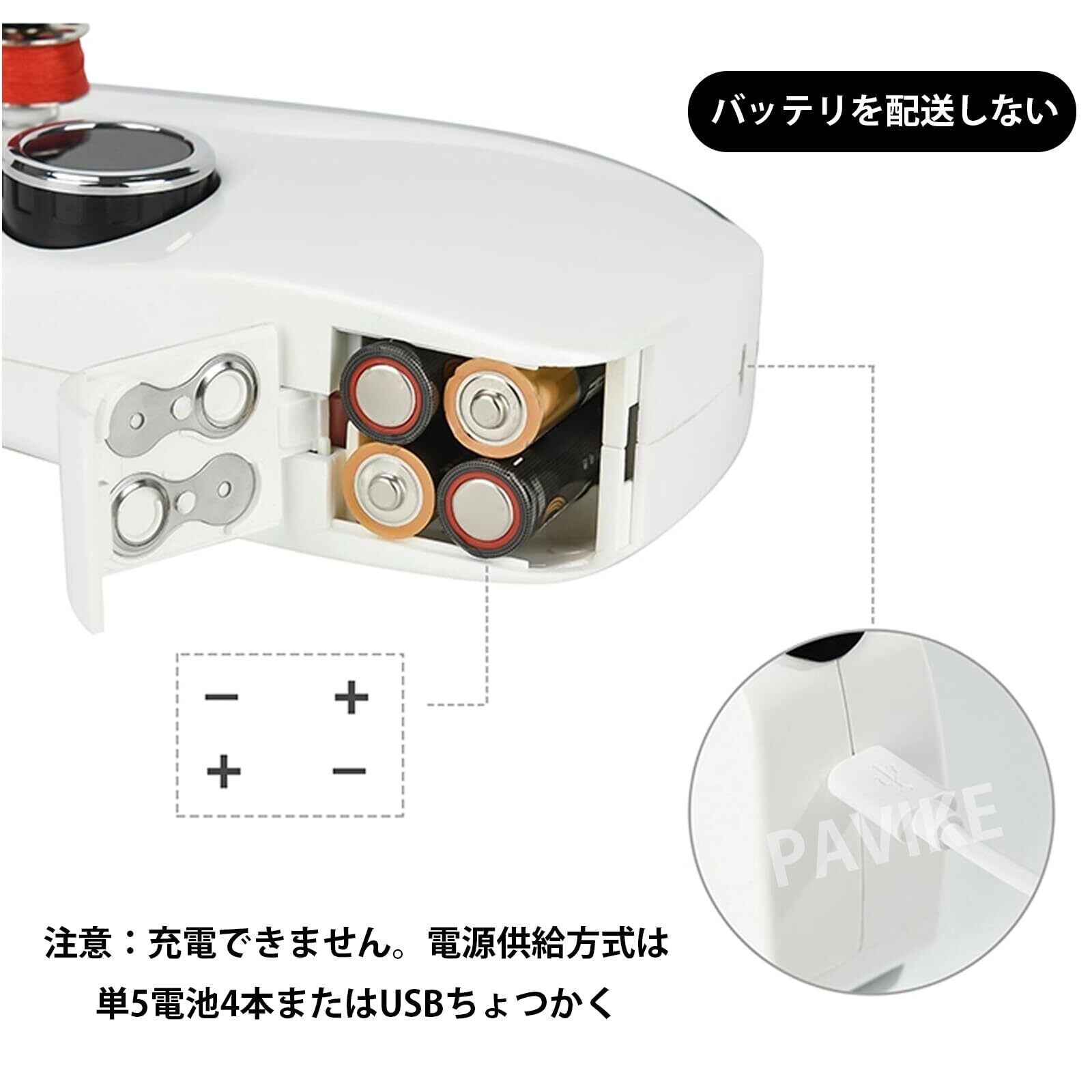 【使いやすい】初心者向けに設計されたインターフェイスはシンプルで直感的なので、初心者でもすぐに使い始めることができます。針への糸通しから縫い始めまで、すべてのステップがシンプルで明快です。自動糸通し機能が搭載されているので、針に糸を通す手間が省け、ソーイングの楽しさをすぐに味わうことができます。電池と USB の 2 種類の給電方式に対応しています(充電機能は付いておりません。電池は同梱されておりませんので、別途単3 形電池を 4 個ご購入ください。)