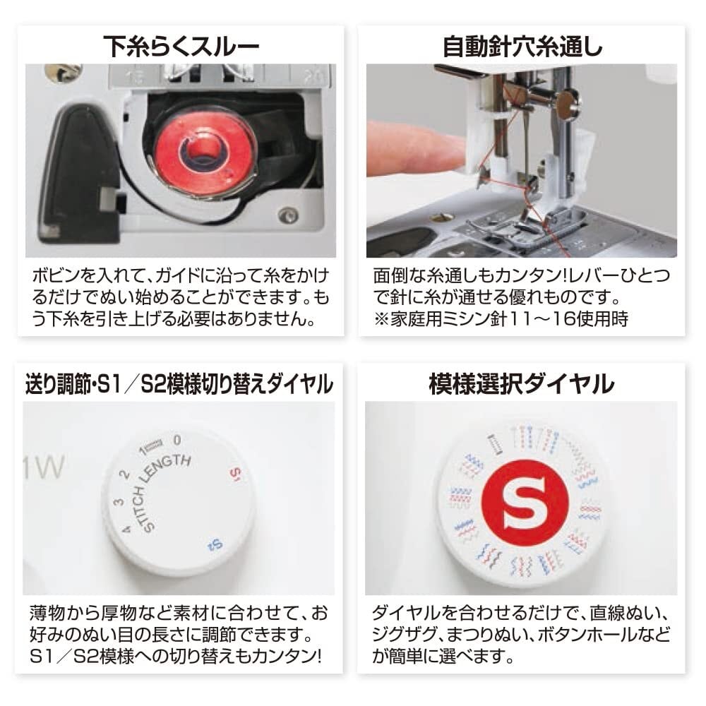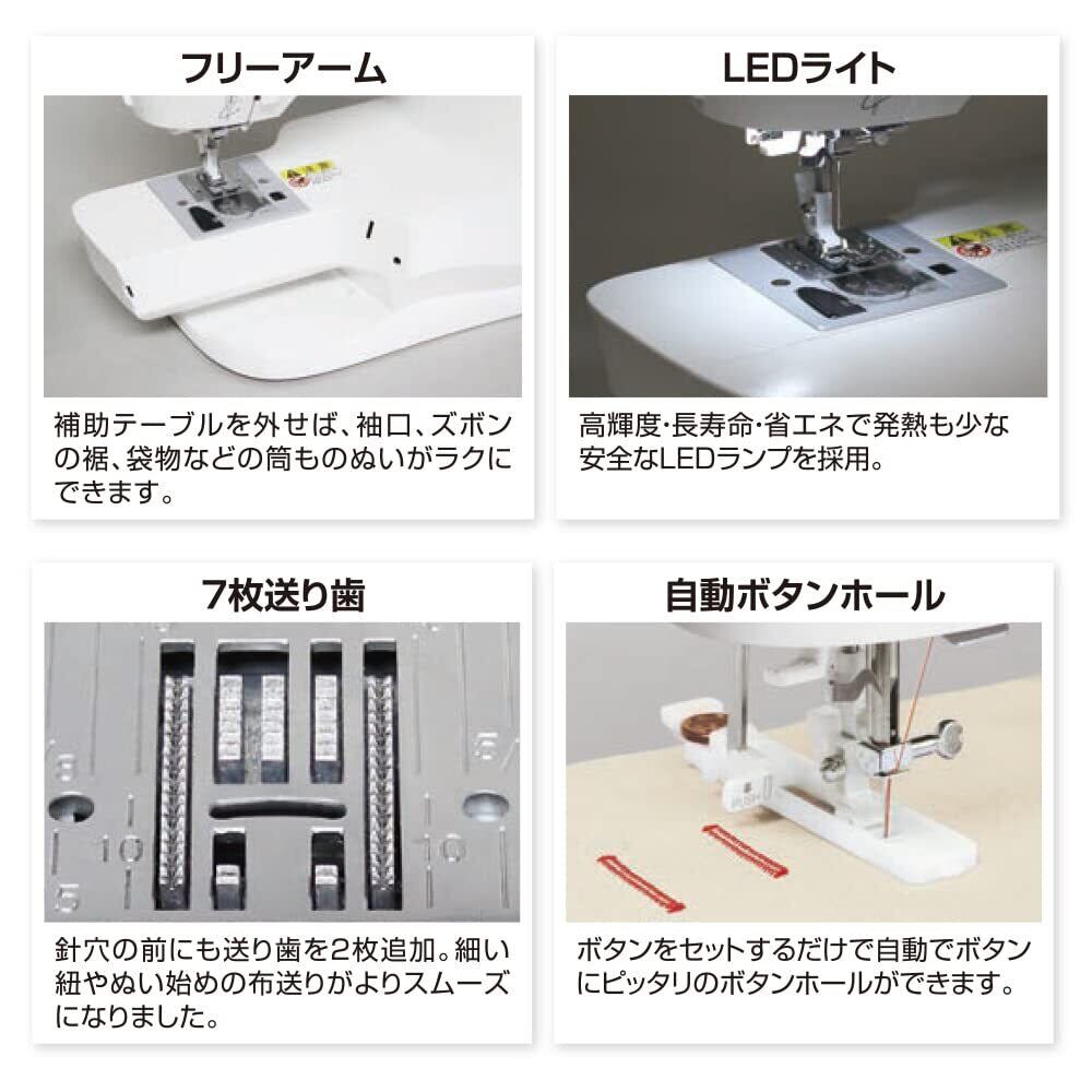 ■ミシン機能:水平全回転ガマ、自動針穴糸通し、フリーアーム、模様選択ダイヤル、厚物縫い、自動ボタンホール、LEDライト、下糸らくスルー