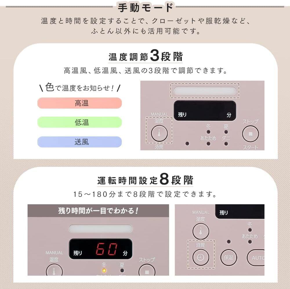 2本のノズルが付属しており、布団の隅々までしっかりと温風を行き渡らせます。これにより、全体的に均一な温度でふんわりとした仕上がりを実現します。