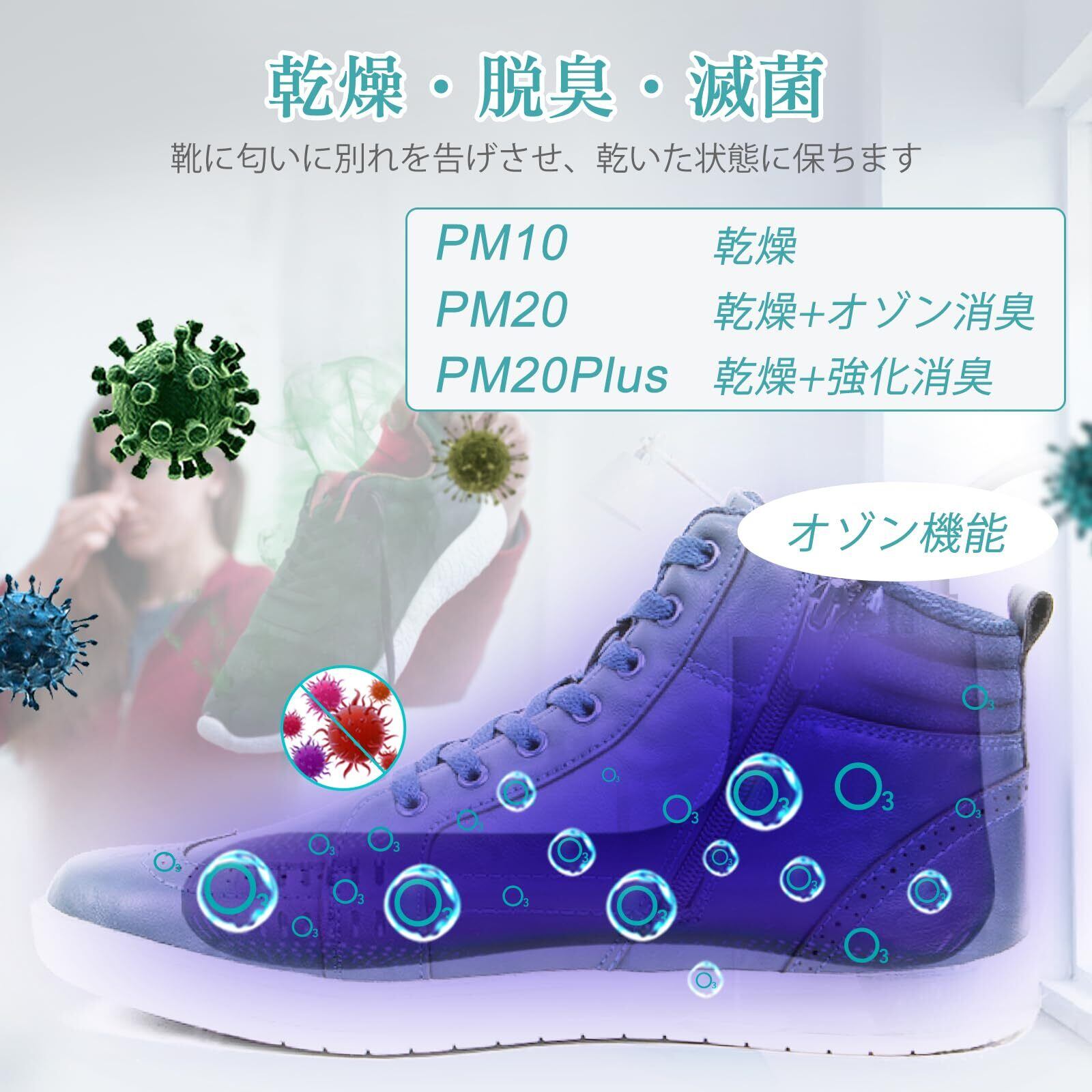 【強化 オゾン脱臭機能】この靴乾燥機は、追加のO3機能を備えています。オゾン排出量はPM20の10倍以上で、より優れた脱臭効果をもたらす。靴乾燥機は、靴の汗をかいた足や異臭を改善し、靴を快適で衛生的に保つのに役立ちます。本製品は、間仕切り、お手洗い、ベランダ、または換気の良い場所での使用を推奨します。