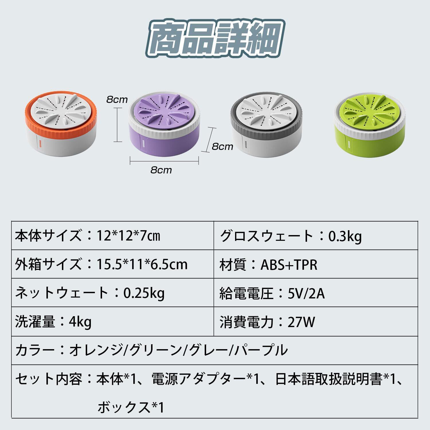 本体サイズ:12*12*7㎝ 外箱サイズ:15.5*11*6.5cm ネットウェート:0.25kg グロスウェート:0.3kg 材質:ABS+TPR カラー:オレンジ/グリーン/グレー/パープル セット内容:本体*1、電源アダプター*1、日本語取扱説明書*1、ボックス*1