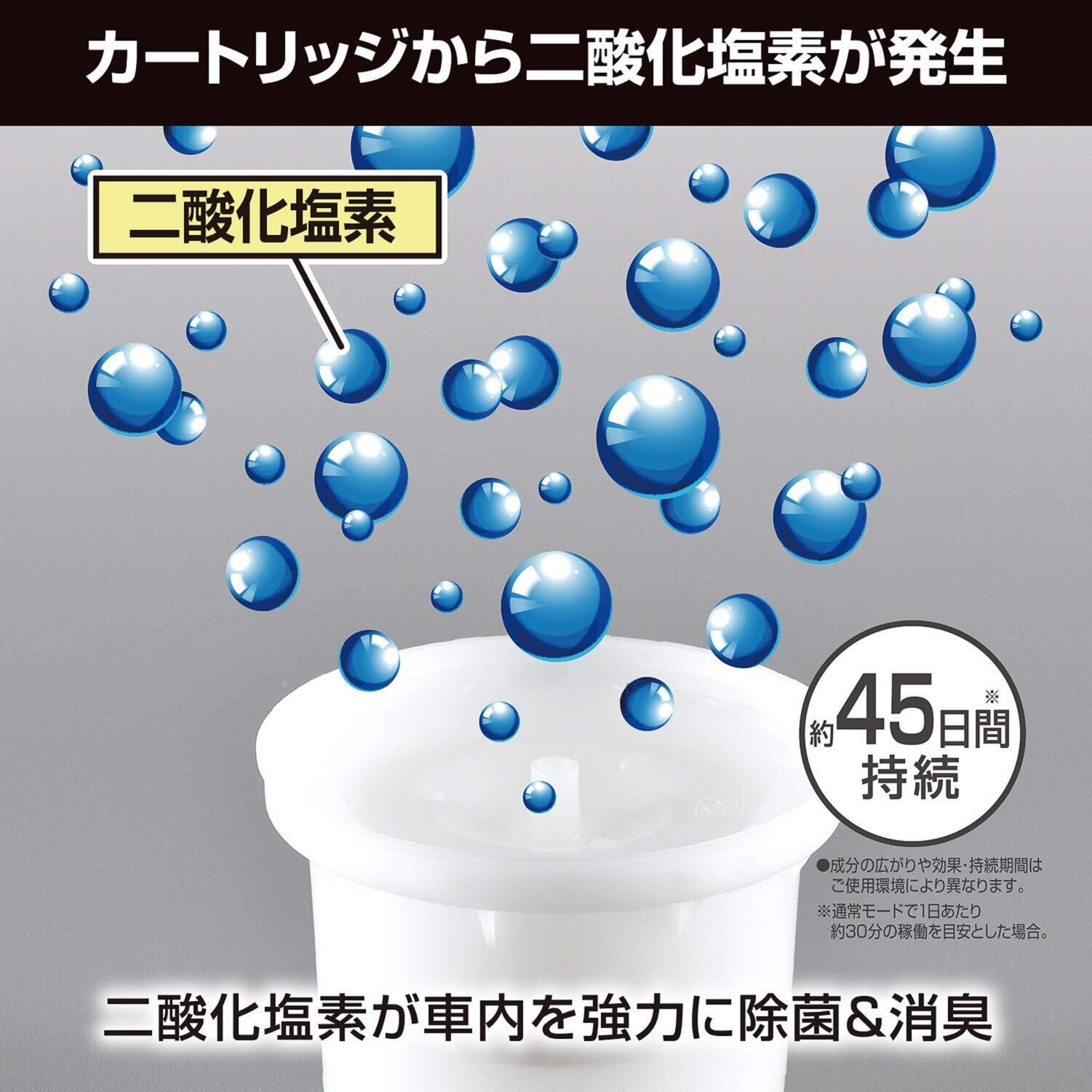 除菌消臭カートリッジから発生した二酸化塩素ガスを、専用設計のファンが吸い上げ強力拡散。除菌消臭カートリッジの効果は約45日間持続します。※通常モードで1日あたり約30分の稼働を目安とした場合(成分の広がりや効果・持続性は使用環境により異なります。)