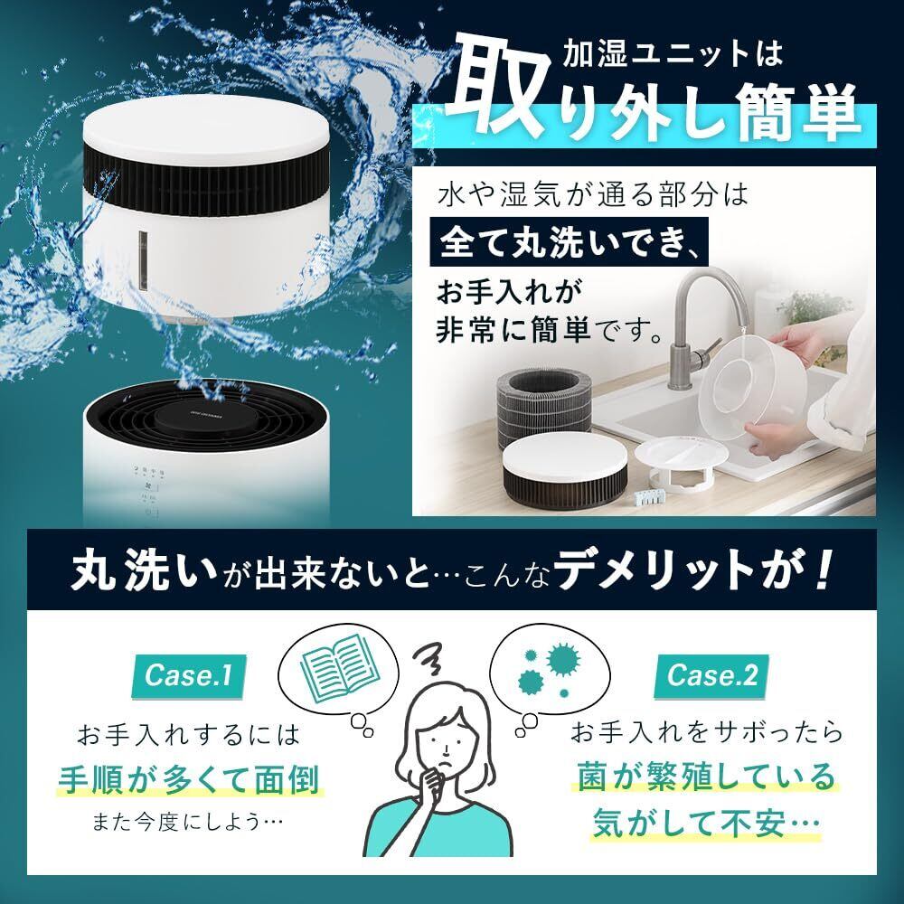 気化式加湿器を搭載しており、ミストや蒸気が発生しないため、床や壁を濡らしてしまう心配がありません。赤ちゃんやお年寄りにも安心してご使用いただけます。フィルターは丸洗いができ、常に清潔な状態を保つことが可能です。