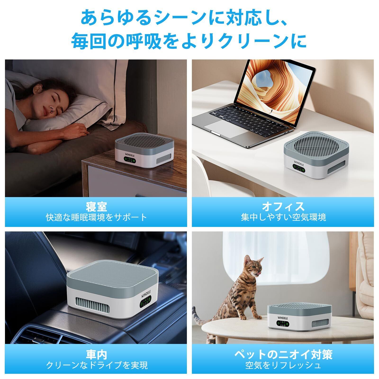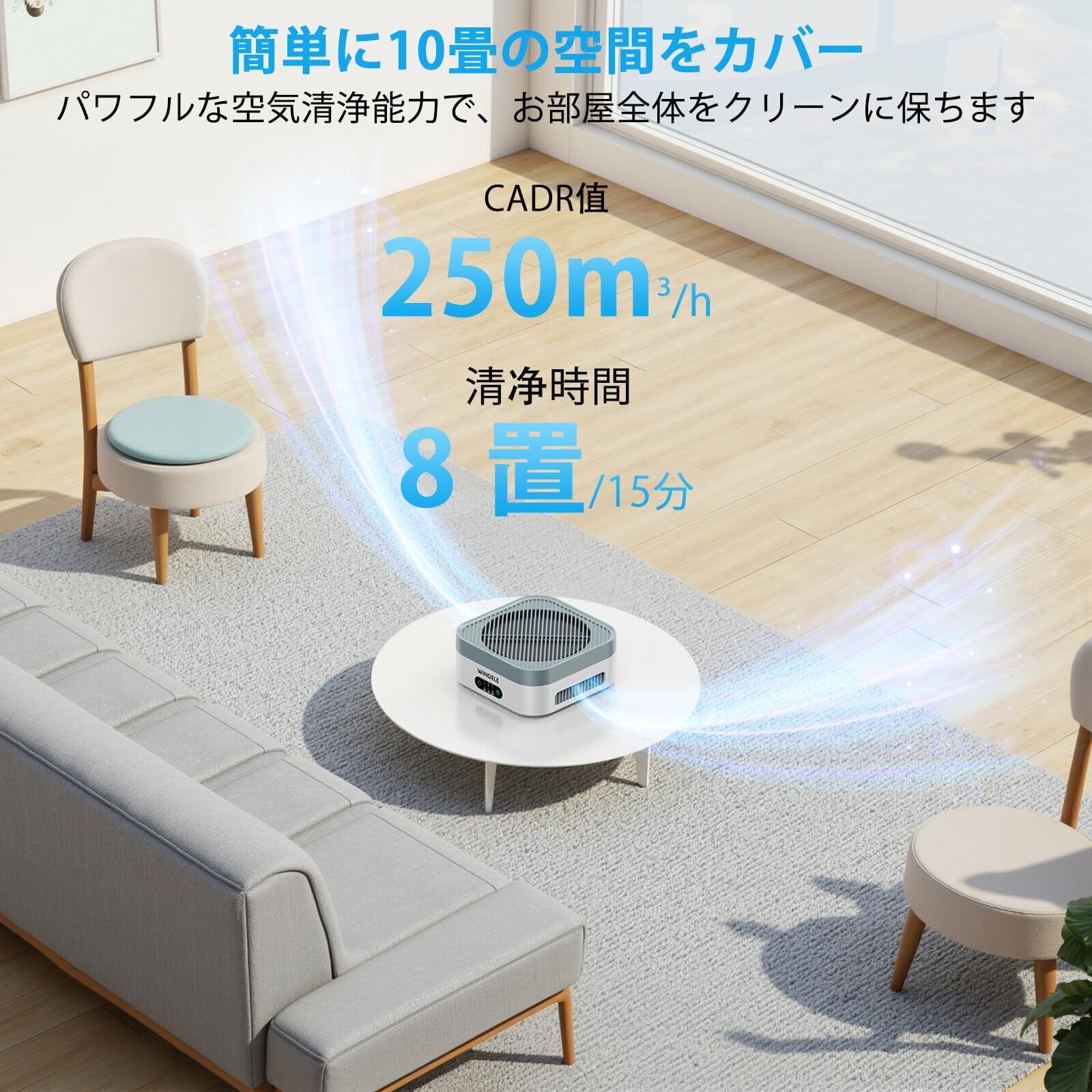 WINDELEの小型空気清浄機は、高性能な3層HEPAフィルターを搭載し、PM2.5や花粉、ペットのアレルゲンをしっかりと捕らえます。いつでも清潔で健康的な空間を保つために、安心してご利用いただける一品です!
