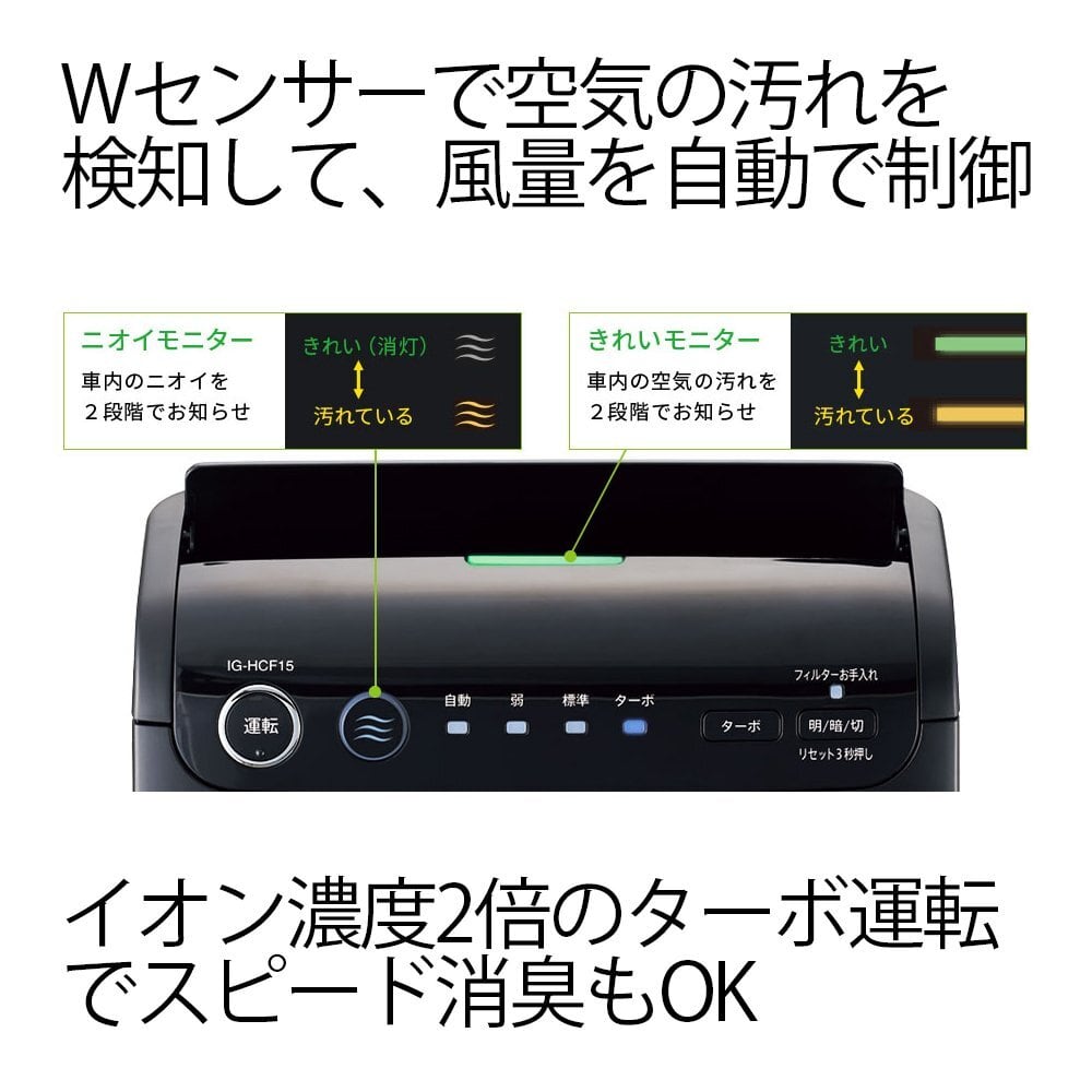 高濃度プラズマクラスター25000を搭載、3つのフィルターで微小な粒子やニオイをキャッチ、車内のホコリや花粉をスピード集じん、Wセンサーで空気の汚れを検知・風量を自動で制御、後部座席のアームレストや運転席・助手席のヘッドレスト背面に手軽に設置可能、イオン濃度2倍のターボ運転でスピード消臭、車のエンジンのON/OFFに連動