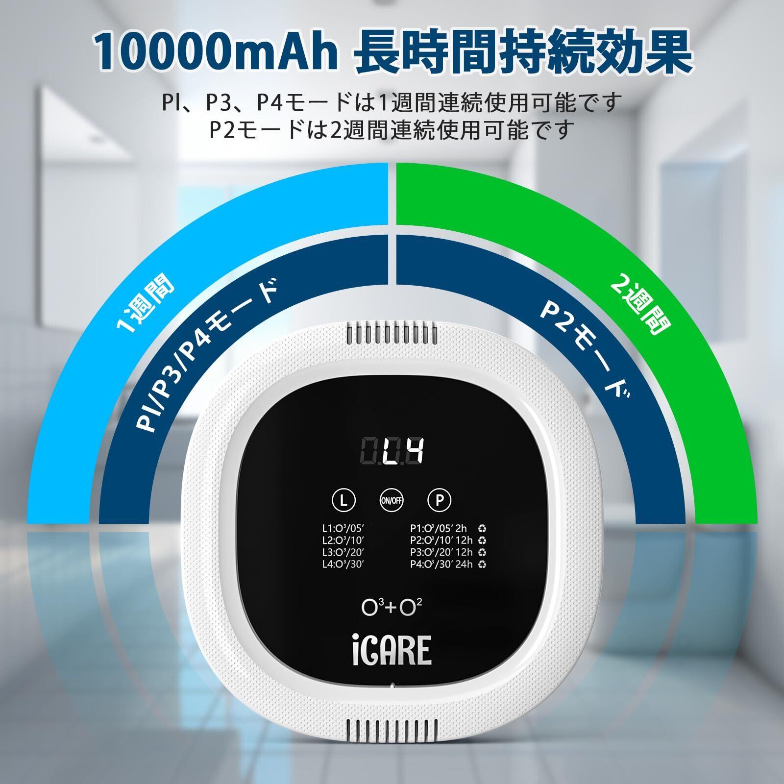 大容量バッテリー搭載|USB充電&コードレス:10,000mAhバッテリー内蔵で、P1/P3/P4モードは約1週間、P2モードは最大2週間使用可能。USB充電式で配線不要、省エネ設計。旅行中のホテルや衣類、寝具の除菌・脱臭にも便利。ご家庭ではデスクや壁掛けで手軽に使えます。
