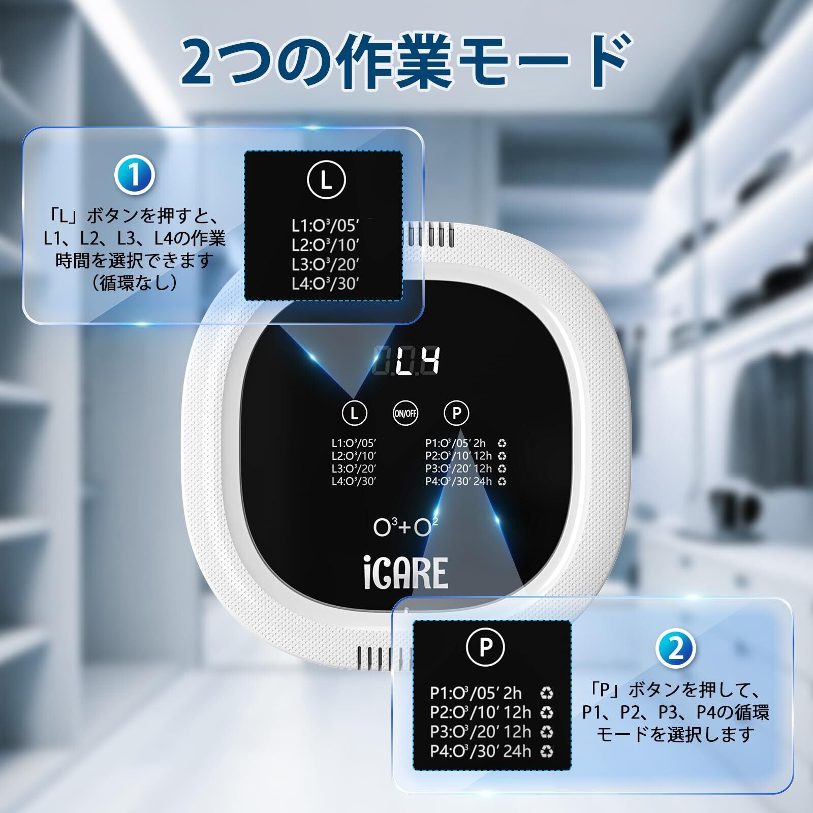 2つの動作モード&8段階のタイマー設定:脱臭機の電源を入れた後、「L」ボタンでL1〜L4の4つの作動時間を選択可能(循環なし)。また、「P」ボタンでP1〜P4の循環モードを切り替えられます。オゾン発生器は5〜40㎡の空間に対応しており、お部屋の広さに応じた設定ができます。