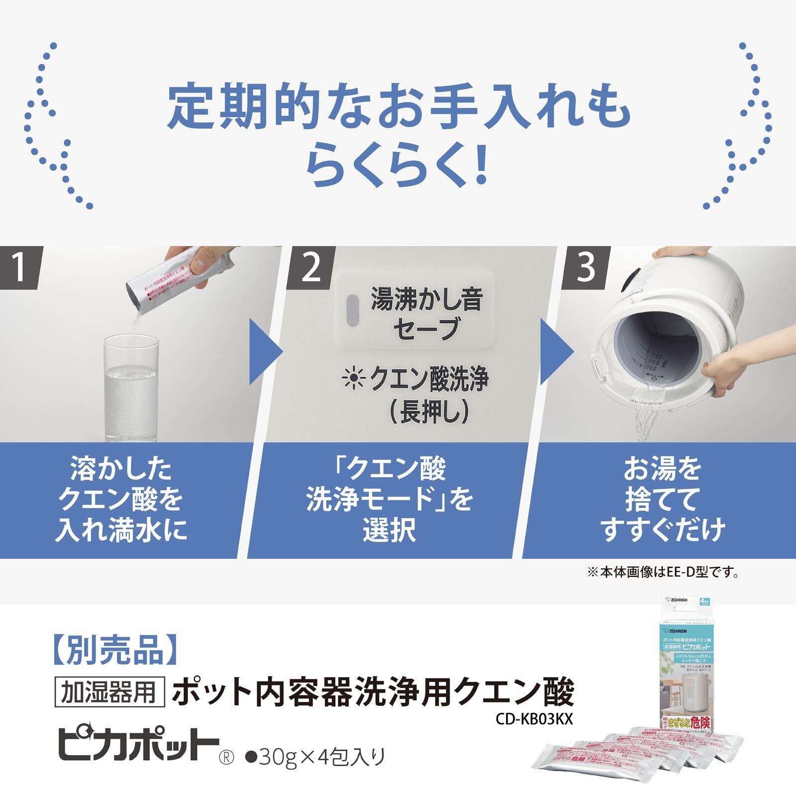 清潔な蒸気で加湿する「スチーム式」で、面倒な「お手入れ」も簡単な広口容器。約8時間の連続加湿で給水の手間が少なく、就寝時に便利なモデルです。