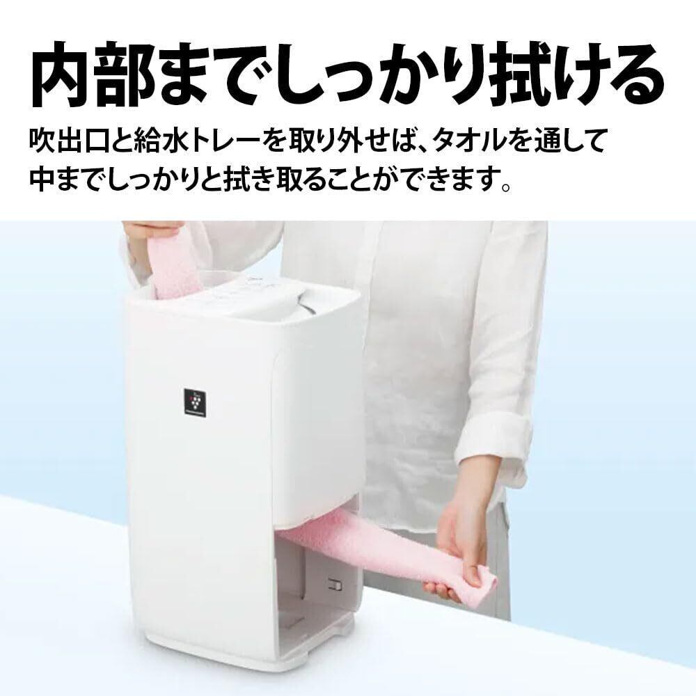 給水もお手入れもカンタン、清潔仕様のレギュラータイプ。ハイブリッド式。水のつぎ足しがカンタン:使い慣れた持ちやすい容器で上から注いで給水、トレーを取り外してたっぷり給水。お子さまからご高齢者まで、使いやすいお好みのスタイルで給水できます。水位がひと目でわかる:操作部の水位表示ランプで、水を注ぎながら水位を確認できます。満水になると音でお知らせします。さらにトレーが半透明なため、離れた場所からでも水の残量がすぐに確認できます。きれいな水と風で清潔なうるおい:プラズマクラスターならではのきれいな風で、清潔なうるおいをお届けします。プラズマクラスター7000搭載:シャープ独自の空気清浄技術、プラズマクラスター7000を搭載しています。「プラズマクラスター」技術で実証している主な効果:浮遊カビ菌を除菌、浮遊ウイルスの作用を抑える、染みついたタバコのニオイを消臭、静電気を抑える。お手入れが簡単な清潔設計:水と風の通り道となるパーツを手軽に取り外して、きれいにお手入れできます。操作部はSIAA抗菌加工の清潔仕様:ボタン操作などで手や指がよくふれる操作部を抗菌加工。清潔を保ちながら、安心の使いごこちを届けます。内部までしっかり拭ける:吹出口と給水トレーを取り外せば、タオルを通して中までしっかりと拭き取ることができます。フィルター乾燥機能で収納時も清潔:専用ボタンを押すと、約60分で加湿フィルターを自動で温風乾燥。シーズンオフには、清潔な状態で保管できます。Ag+イオンカートリッジできれいな水で加湿:給水トレーの中に取り付けて使う、付属のAg+イオンカートリッジ。トレーのヌメリやニオイの元となる水中の菌を抑制し、1年に1回の目安で交換することで、きれいが持続します。(交換用イオンカートリッジは別売です)コンパクト設計:幅約27cmで、ほぼA4サイズの面積で設置が可能。縦型スリムな省スペース設計だから、寝室などのパーソナルスペースにもおすすめです。エコモード:ヒーターレスで省エネ加湿できる、エコモードを搭載しています。温度・湿度Wセンサー:室温に合わせて、55~65%の快適な湿度に制御できます。チャイルドロック:お子さまのいたずらや誤操作を防止します。信頼のS-JET認証取得:第三者認証機関によって製品試験及び工場の品質管理の調査が行われている証です。