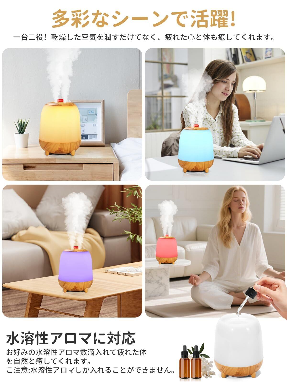 【七色LEDライト&次亜塩素酸水対応&アロマ対応】7 色 LED ライトは 1 色に固定することも、複数の色を循環させることもできます。7色の変化するLEDライトはベッドサイドで夜間照明として役に立ちます。この卓上加湿器は、細やかな加湿ができるだけでなく、除菌液と組み合わせて空気清浄も可能です。乾燥した空気を潤しながら、積極的に環境を浄化し、心身を癒し、安全に守られた居住空間を提供します。水溶性アロマにも対応可能、数滴だけ入れて、一日の疲れた体を癒してくれます。️ご注意:水溶性アルマオイルしか入れることができません。普通のアロマオイルは油なので水と混ざらず、タンクの中に入れると油膜ができてカビや雑菌、劣化の原因となってしまいます。