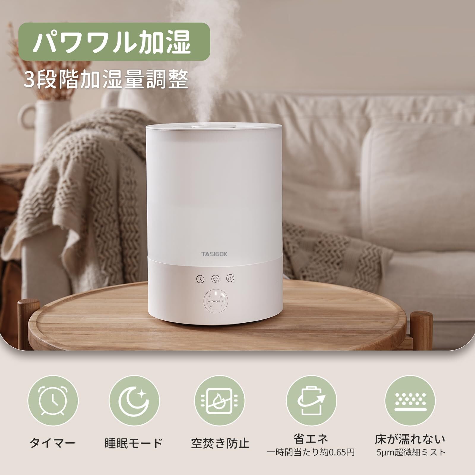 この加湿器は、2.5Lの大容量タンク、3段階ミスト調整、静音設計、アロマ機能、上から給水可能など多彩な特徴を持ちます。リビングや寝室、オフィスなど、さまざまな生活シーンで活躍し、心地よい空間を保ちます。