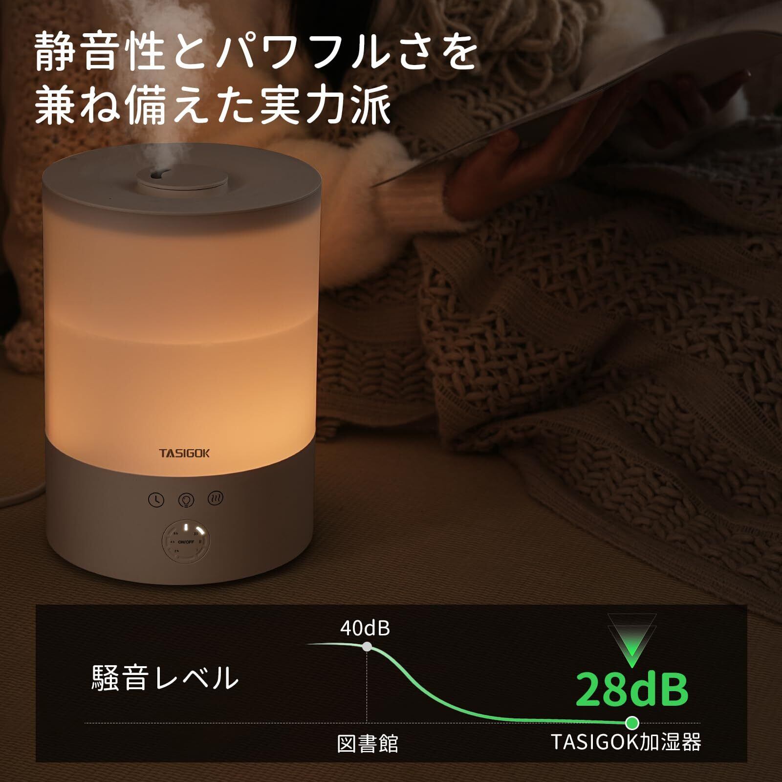 3段階ミスト量調整ができ、28dBの静音設計で、快適な睡眠や集中環境を実現。必要に応じてミストの強さを選べるため、お部屋ごとに最適な加湿を提供します。快適な湿度で、乾燥からくる肌のトラブルも軽減します。