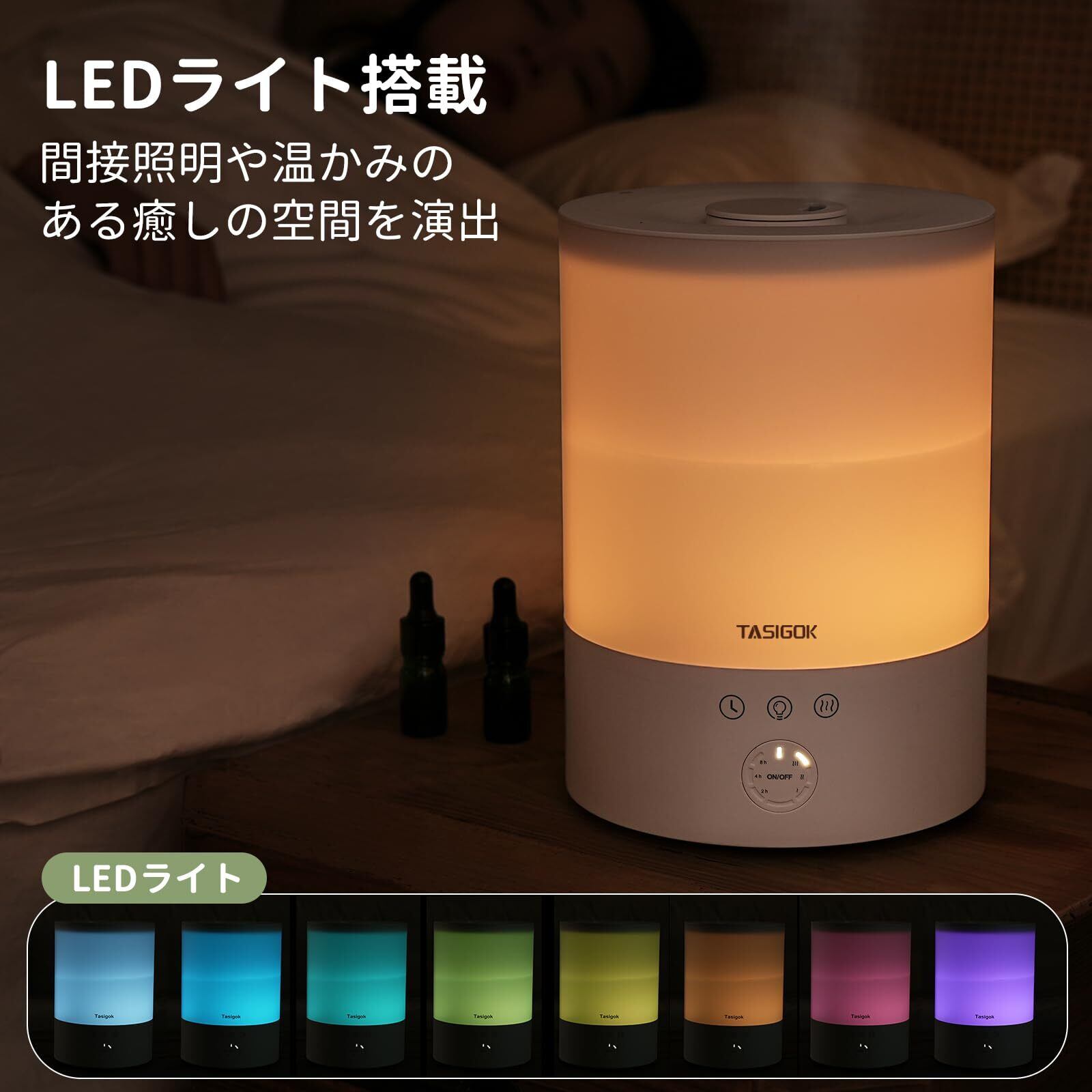 【1台3役:3段階加湿量&ナイトライト&アロマオイル対応】タッチ操作で弱・中・強の3段階の加湿量を選択でき、会社・リビングや寝室など、部屋の大きさや季節に応じた設定が可能です。オシャレなLEDライトは8色循環モードと単色固定モードを搭載しており、リラックス空間を演出します。食品にも使えて安全性の高いPP材料で作られた水タンクに、お好きなエッセンシャルオイルを入れると、アロマディフューザーとして、加湿しつつも、香りによる心地よさを得られます。水溶性オイルをおすすめします。