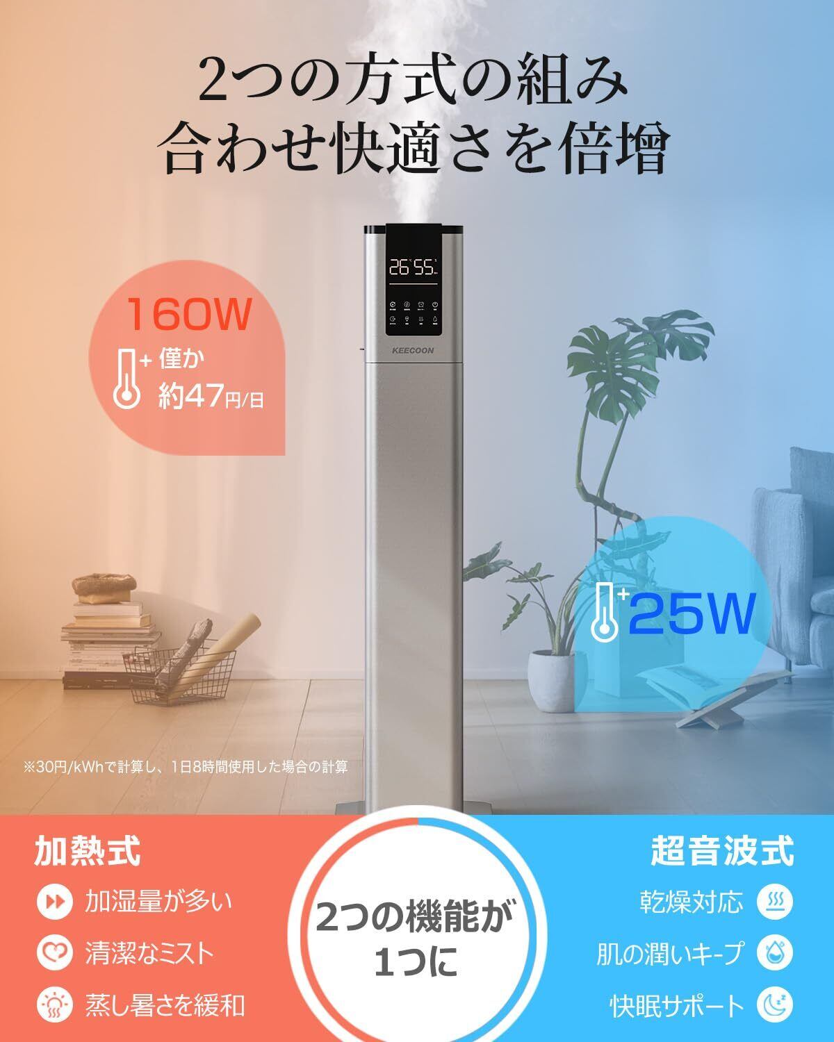 KEECOON 加湿器 スチーム式 大容量13L 100℃高温除菌 加熱式 +超音波式 ハイブリッド式 アロマ加湿 器. お手入れしやすい 自動湿度調整 タワー 上から給水 水浄化 省エネ 遠隔制御 最大噴霧量500ML/H 40畳 30dB静音 おやすみモード 連続48時間 スタイリッシュ床置き 学校 事務所 家庭用 オフェス 寝室 病院 美容院 業務用 空焚き防止 シルバーブラック