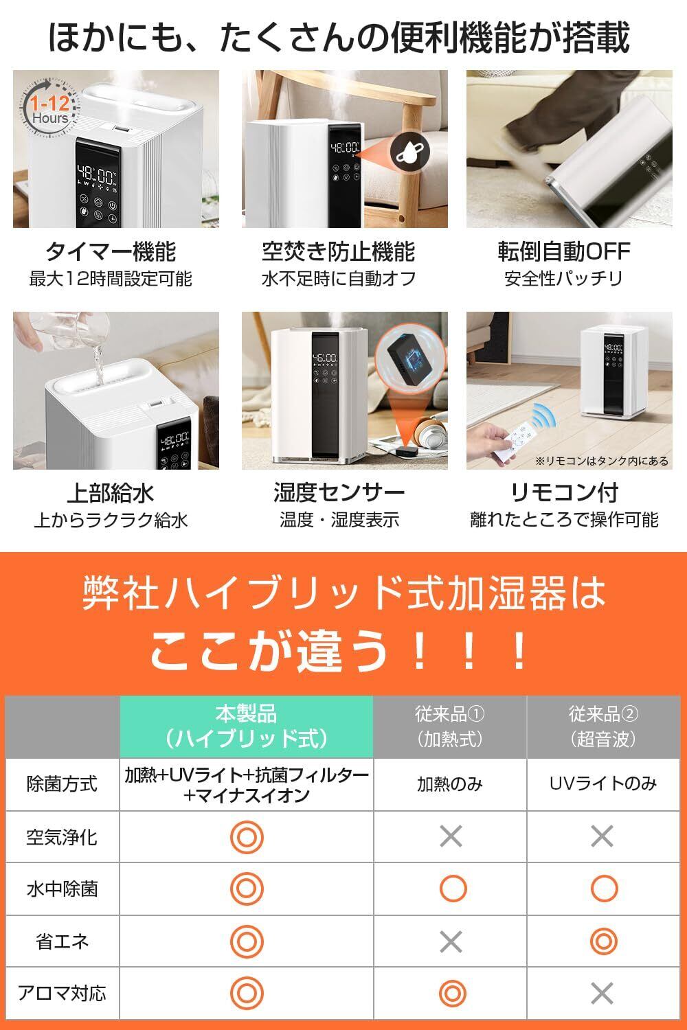 【自動切りタイマー機能&空焚き機能付】安全面も配慮し、12Hのタイマー機能搭載、外出した時の電源切り忘れ防止、電気代の節約や加湿しすぎ防止に役立ちます。そして、空焚き防止機能搭載、水がすくなくなったら、自動的に電源オフしますので、安全安心にご利用いただけます。
