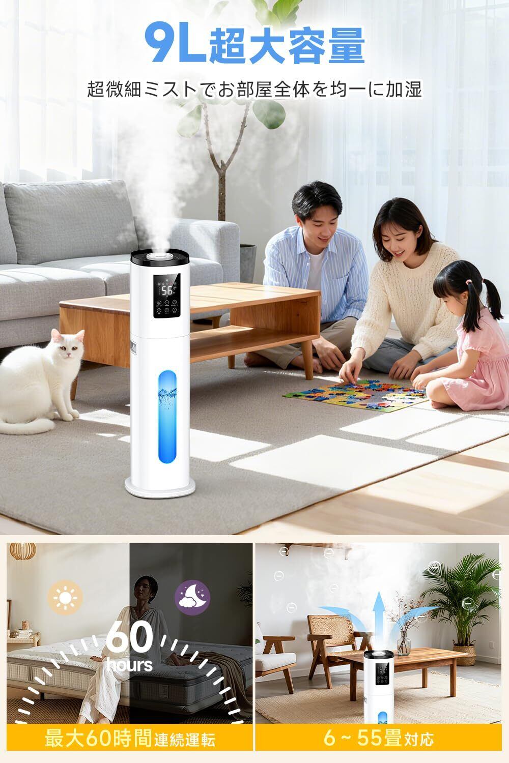 加湿器 大容量 9L 【2025年冬新登場・知能恒湿・4重除菌浄化】 超音波加湿器 タワー型 AIスマート 空気清浄 アロマ対応 24時間タイマー 上から給水 静音 省エネ マイナスイオン 銀イオン抗菌素材 4段階加湿量調節 吹出口360°調整 上から注水 花粉症対策 水漏れ防止 乾燥防止 空焚き防止機能 リビング/寝室/オフィス/会社用 リモコン付き 取扱説明書付き (ホワイト)