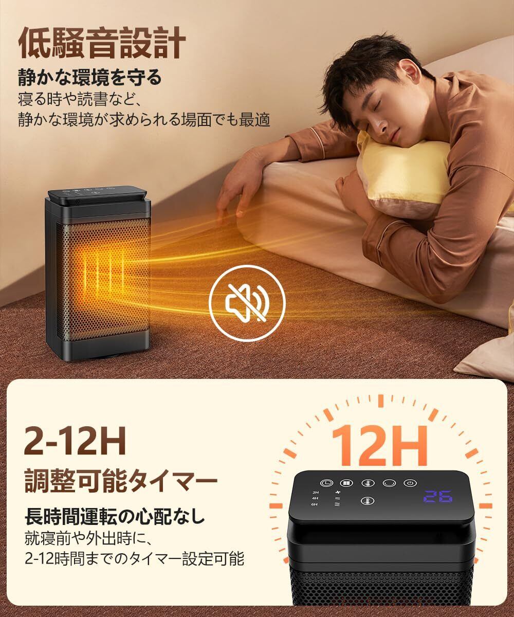 【安心安全設計・静音運転】 家庭用ファンヒーター 安全性を最優先に考えた設計で、転倒時には自動で電源がオフになる「転倒自動OFF機能」を搭載。また、内部温度が一定以上に上がった際には自動で運転を停止する「過熱防止機能」も備わっており、長時間の使用でも安心な 電気セラミックファンヒーター です。さらに20dB前後の低騒音設計で、睡眠中や読書中でも音が気にならず、快適な時間を邪魔しません。 コンパクトヒーター 2〜12時間まで設定可能なタイマー機能も搭載しているため、就寝時や外出時にも安心して使用できます。安全性と静音性の両立で、小さなお子様や高齢者、ペットのいるご家庭にもおすすめの 暖房器具 です。