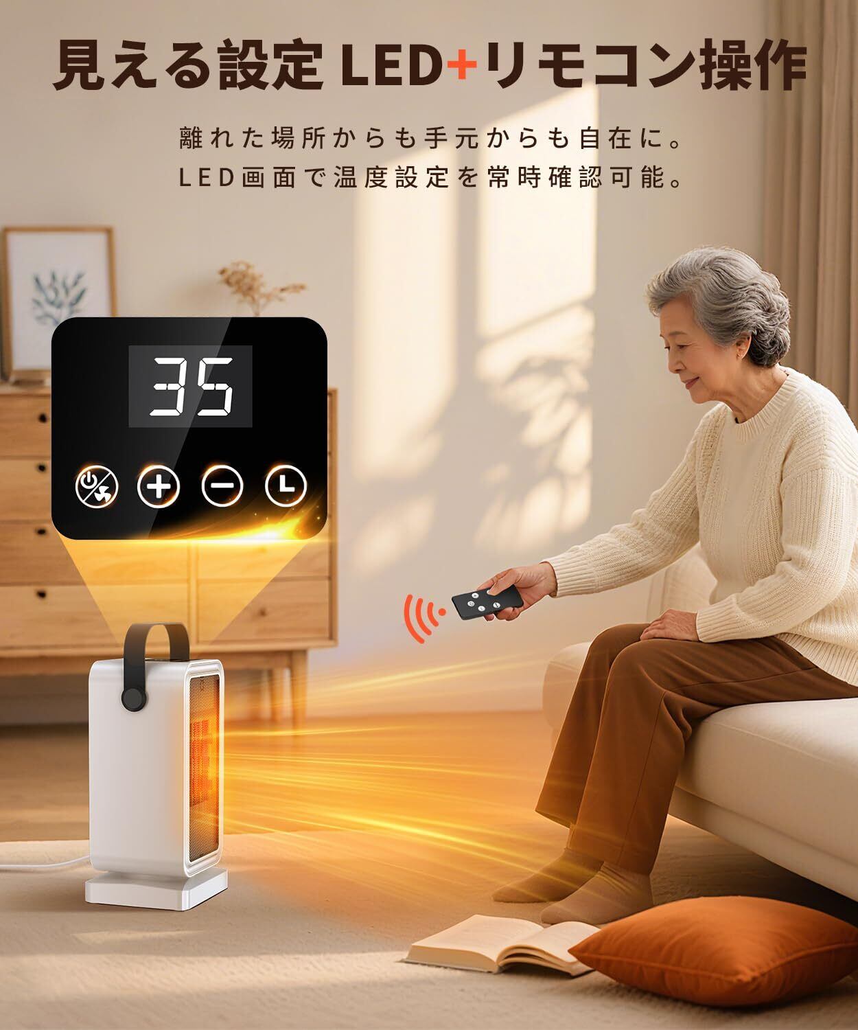 便利機能搭載-タイマー・リモコン・LED 表示 1~12Hタイマー機能(1H単位)を搭載し、 セラミックファンヒーター の作動時間を柔軟に設定できます。設定時間が経過すると自動停止し、睡眠時にタイマーを設定すれば省エネで使用できます。リモコン操作で温度やタイマーの調整が簡単にでき、高齢者や体の不自由な方にも適しています。ソファやベッドからでも 暖房器具 を簡単に操作でき、利便性が大幅に向上します。LEDディスプレイにより、リアルタイムで情報を確認でき、操作が直感的になります。