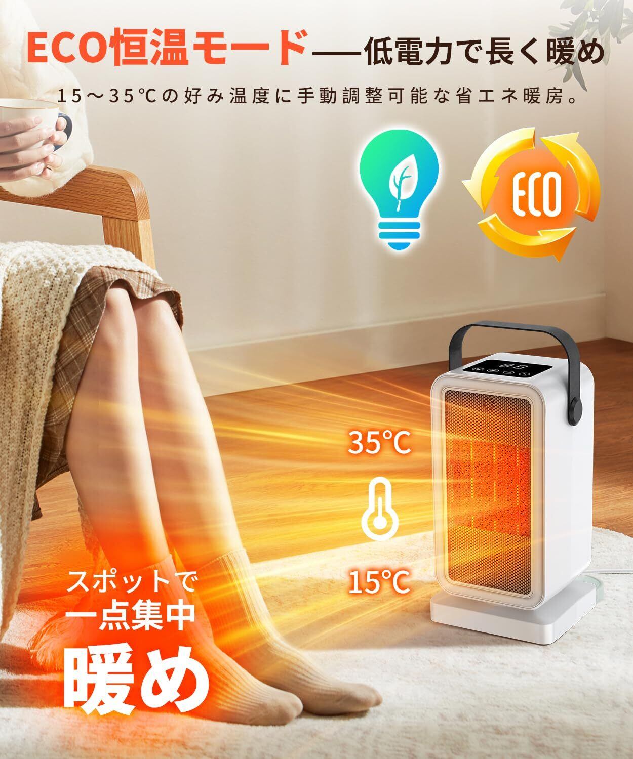 ECO知能恒温技術+2段階熱量 ヒーター 省エネ ECO知能恒温技術により、15~35℃(1℃単位)の温度調節が可能で、500Wと680Wの2段階熱量調節を提供します。680W-2秒瞬暖&500W-静音運転。お好みや環境に応じて最適な温度と熱量を柔軟に調整でき、さまざまな暖房ニーズに対応します。ECO技術により、省エネがされ、無駄な電力消費を避け、電気代の節約にも貢献します。寒い冬には、セラミックヒーター 10畳 サイズの部屋で、正確に温度を調節し、部屋の隅々まで快適な暖かさを提供します。