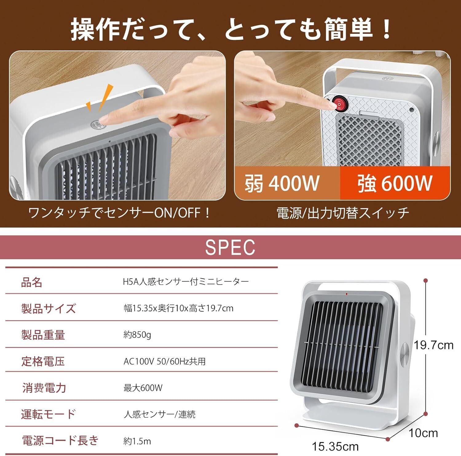 【2025冬の定番!】ヒーター 小型 人感センサー付 セラミックヒーター 省エネ 速暖 足元 トイレ 洗面所 脱衣所 400W/600W 角度調節 転倒OFF 過熱保護 ミニ セラミックファンヒーター 静音 節電 電気 暖房 オフィス 卓上 デスク下 (Gray)