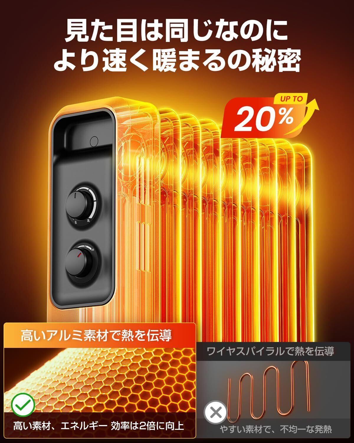 【2025年冬の新作、寒~い冬もあったかが楽しめるオイルヒーター】これからの寒い冬をお部屋で暖かく快適に過ごしませんか?従来のオイルヒーターは電気の力でオイルをあたためて、本体のパネルの真ん中のヒーター管にオイルの熱が伝わって放熱するタイプで、十分な暖かさが得られない!そこで、パネルが全方位発熱できるオイルヒーターを開発しました。コストが15%上昇したにもかかわらず、部屋全体をより早く温められる熱効率が20%UPしました。さらに、オイルヒーターは輻射熱と自然対流によって湿度を下げずに暖めるため、寒い冬でも体全体が驚きのぽかぽかを実感!
