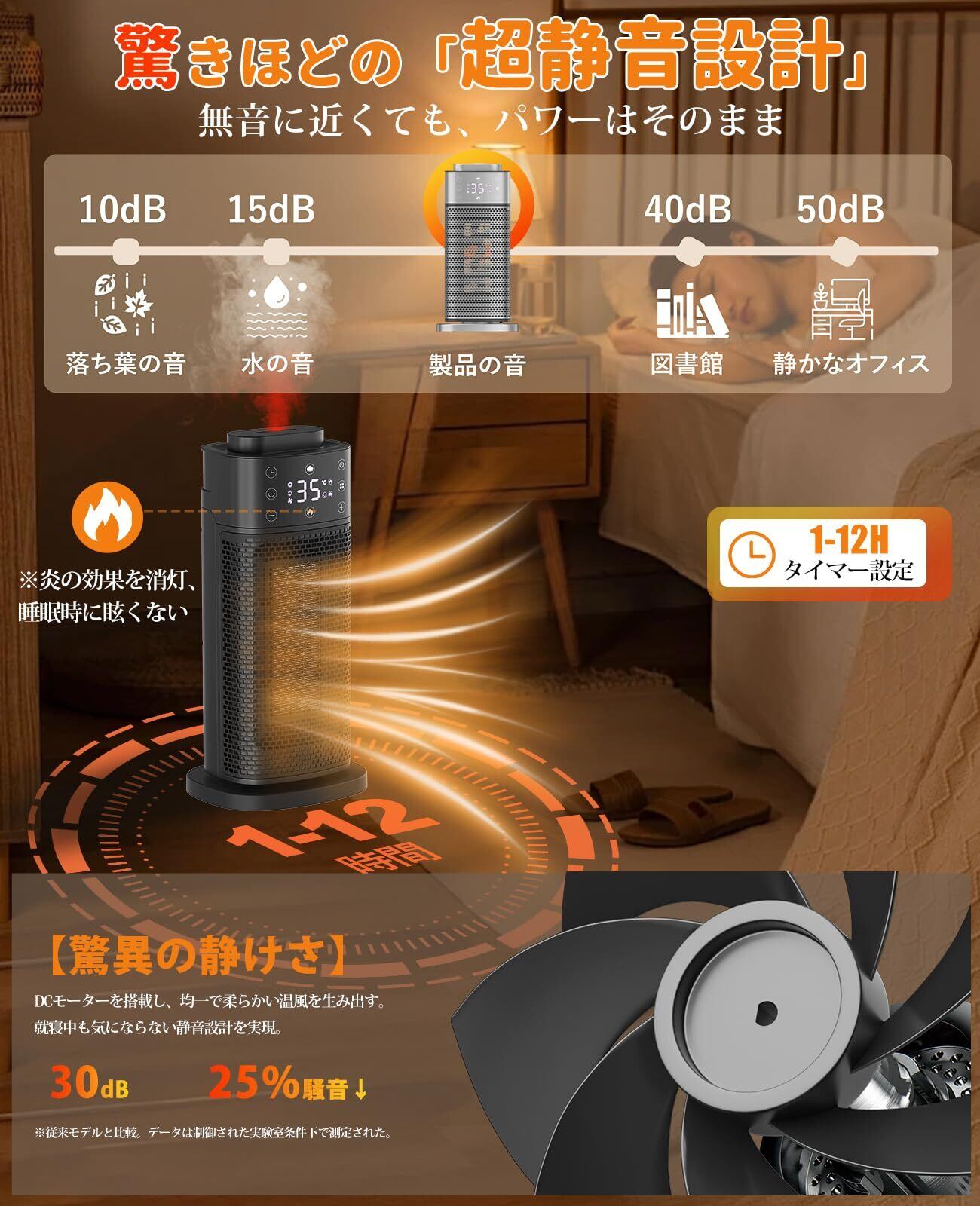 極めて静か・雰囲気ライト:業界トップレベルの静音技術と独特な内部構造で動作音を30dB以内に抑え、ついに無音作動を実現!このセラミックヒーターは雰囲気ライトモードが付き、やさしく灯るLEDムードライトでゆったりとリラックスします。お好みで雰囲気ライトをON/OFFすることができ、いつものお部屋が癒し空間へ早変わります。音や光に非常に敏感な赤ちゃんもペットもぐっすり眠れます。切りタイマーを付き、お出かけや睡眠など時に利用すると、切り忘れとの心配がなく、十分な暖かさを安心に楽しむ。寝室や書斎などで使用する場合は、静音タイプを選ぶのがおすすめ。就寝前・読書・勉強・テレワークなど、集中したいときも快適に使えます。