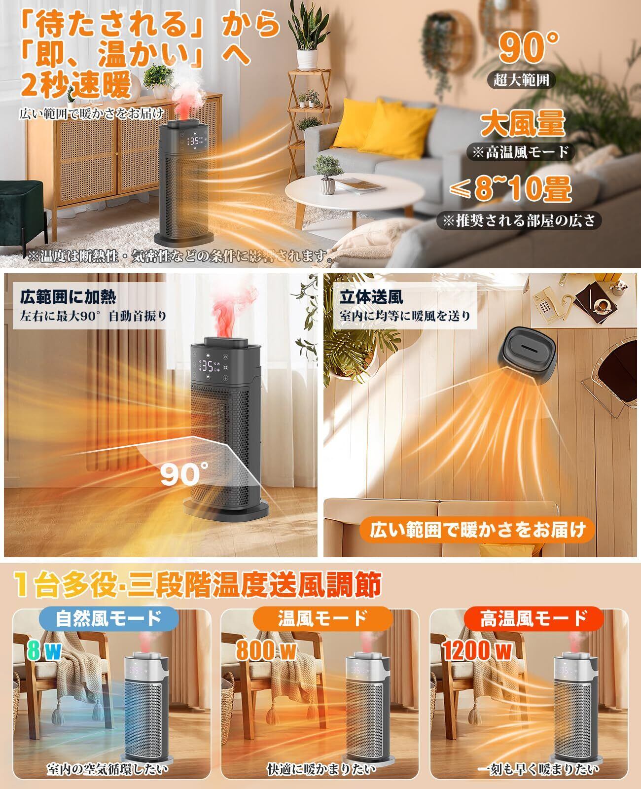 2秒で速暖!節電対策を実現するECO恒温モード:セラミックヒーターは高品質な安全性高いPTCセラミック加熱素材を採用し、7枚*2羽根のDCモーターを搭載し、僅か2秒で急速加熱できます。PTCに通じで加熱するため直火なし、燃料不要、更に有害ガスなし電気タイプです。4種風モード「高温風1200W」「低温風600W」「自然送風モード10W」「ECO恒温モード」で寒い冬も楽々乗り切れます。 ECO知能恒温機能では、お好みの温度は0℃~35℃まで1℃ごとに設定可能、また周囲温度に合わせて、運転を自動的に切り替え、電気代を節約しながら快適な体温を維持。寒い季節には、部屋の隅々まで素早く効果的に熱を満たし、冬は暖かく保ちます。注:温度を調整すると、ECOモード(風マークなし)が表示されます。 高温が必要な場合は、引き続き最高温度に調節してください。※弱強風時のECOモードはありません。