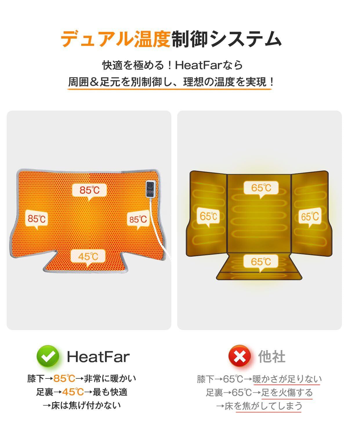 【デュアル温度制御システム・最も快適と感じるを実現】HEATFARは独自の設計により、周囲ヒーターと足底ヒーターは自動的に別々に制御される!人が最も”快適”と感じる理想的な温度状態を実現するために、膝下は85℃の高温に達し、足裏は最も快適な45℃に止まる。従来のパネルヒーターは、すべての加熱面が同じ温度(65℃)になるため、①膝下が十分に暖まらず、②足を火傷の恐れがあるだけでなく、長時間使用すると床を焦がしてしまう。5段階温度調節機能と9段階時間調節機能が付いて、シーンに合わせたお好みでご活用ください。さらに手の届きやすい位置にあるスイッチで簡単に切り替えることができる。
