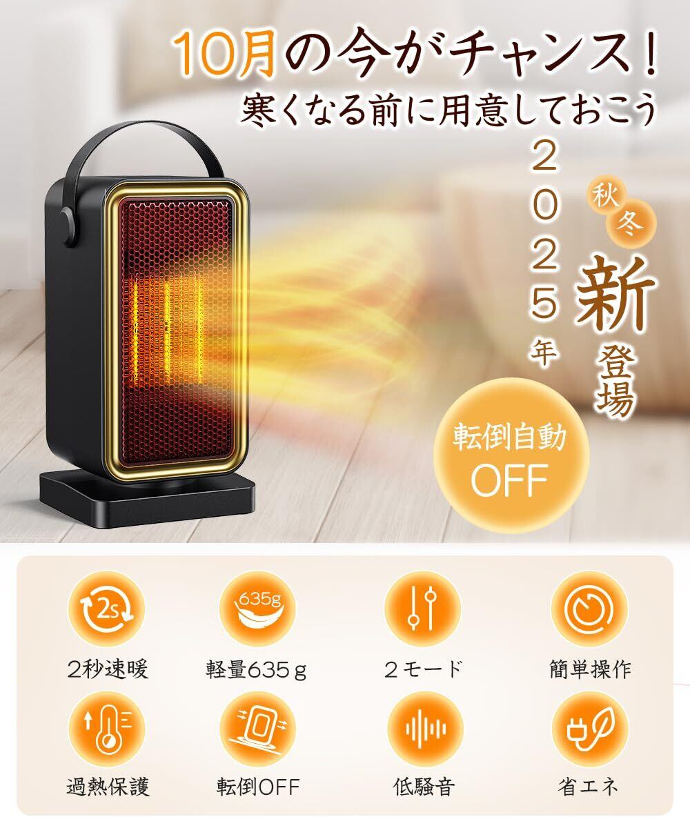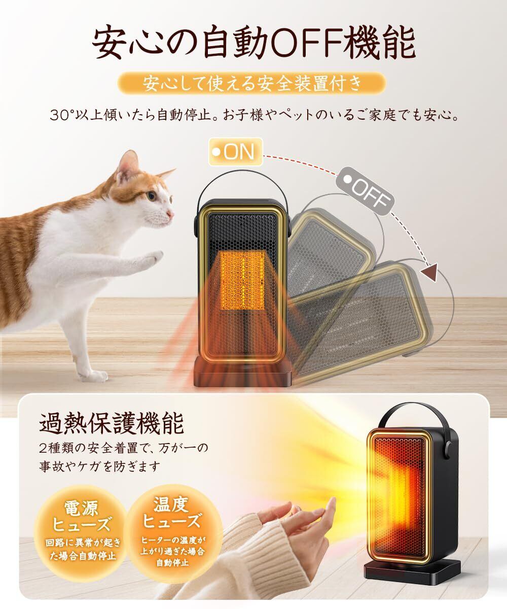 このヒーターは、転倒時自動OFF機能と過熱保護機能を備えており、お子様やペットのいるご家庭でも安心です。安全性能に優れた設計が施されており、万が一の事故にも強い頼もしい商品です。