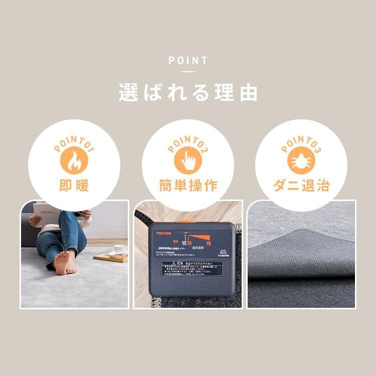 TEKNOSのホットカーペットは、ダニ退治機能を搭載しており、熱の力でダニを効果的に退治します。アレルギーを気にする方や小さなお子様がいるご家庭でも安心して使用できる、清潔な空間を提供します。